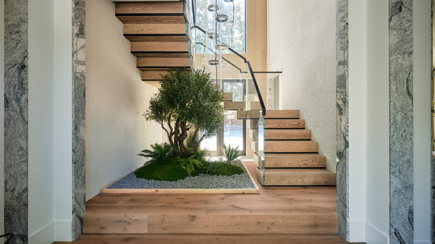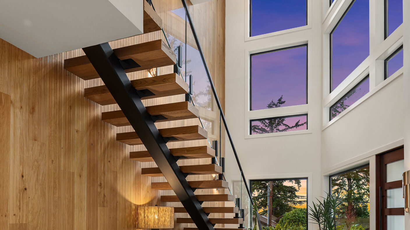 This entryway captures the essence of design with rising floating stairs and clear glass railing. FLIGHT Mono connects the multiple levels with elegance while the glass railing creates clear views between spaces.