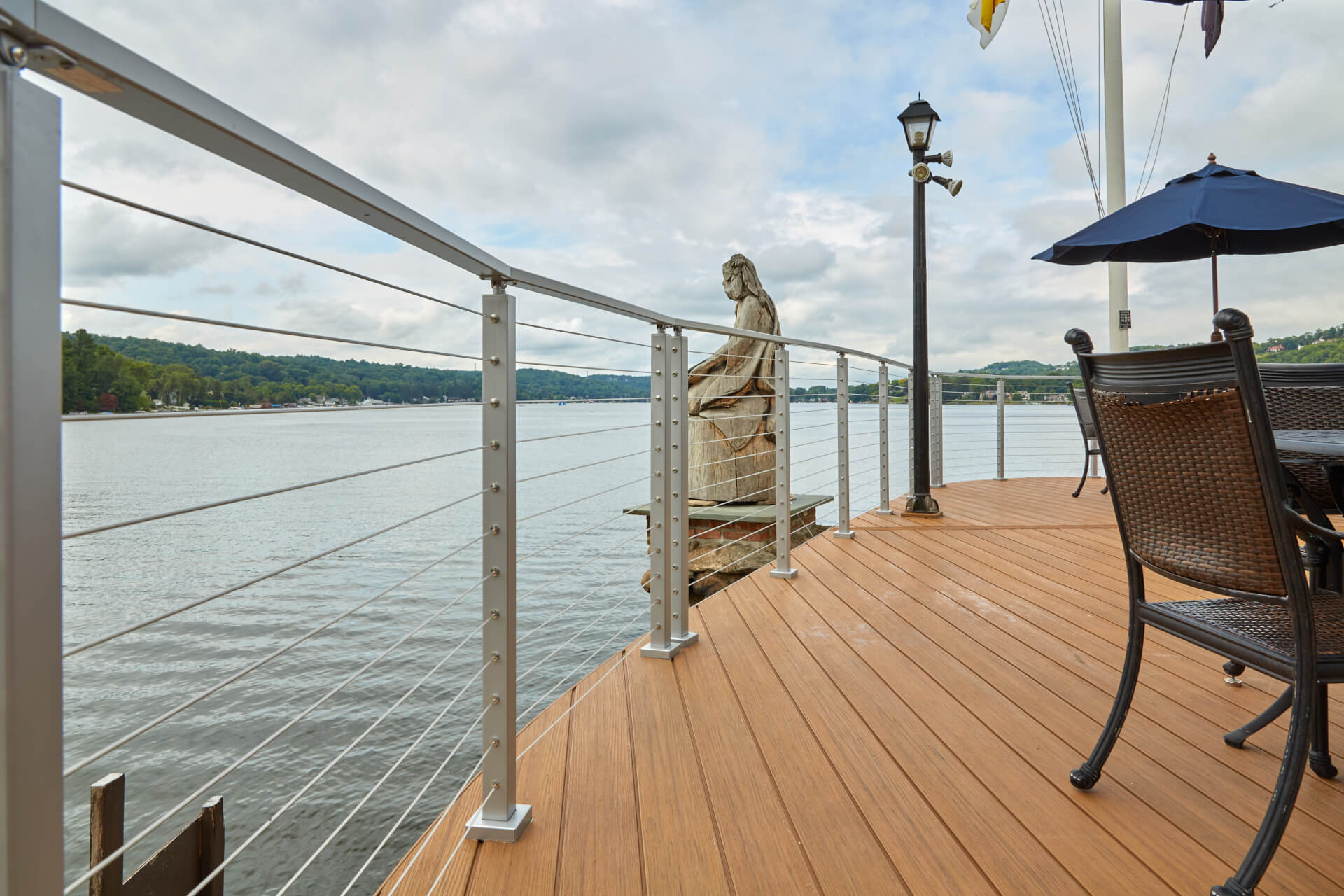 With a creative deck shape and beautiful view, this restaurant’s railing system had to be easy to install, flexible in design, strong and obscure. The owners opted for a Surface Mount cable railing system with a metal 1″x2″ handrail on top. Finished with a durable Fluoropolymer Speedboat Silver powder coat, not only does the railing blend in with it’s surroundings, but the finish will remain untarnished for years. In order to curve the railing with the edges of the deck, the installers used a few double posts and some great miters to create a seamless, smooth railing system.