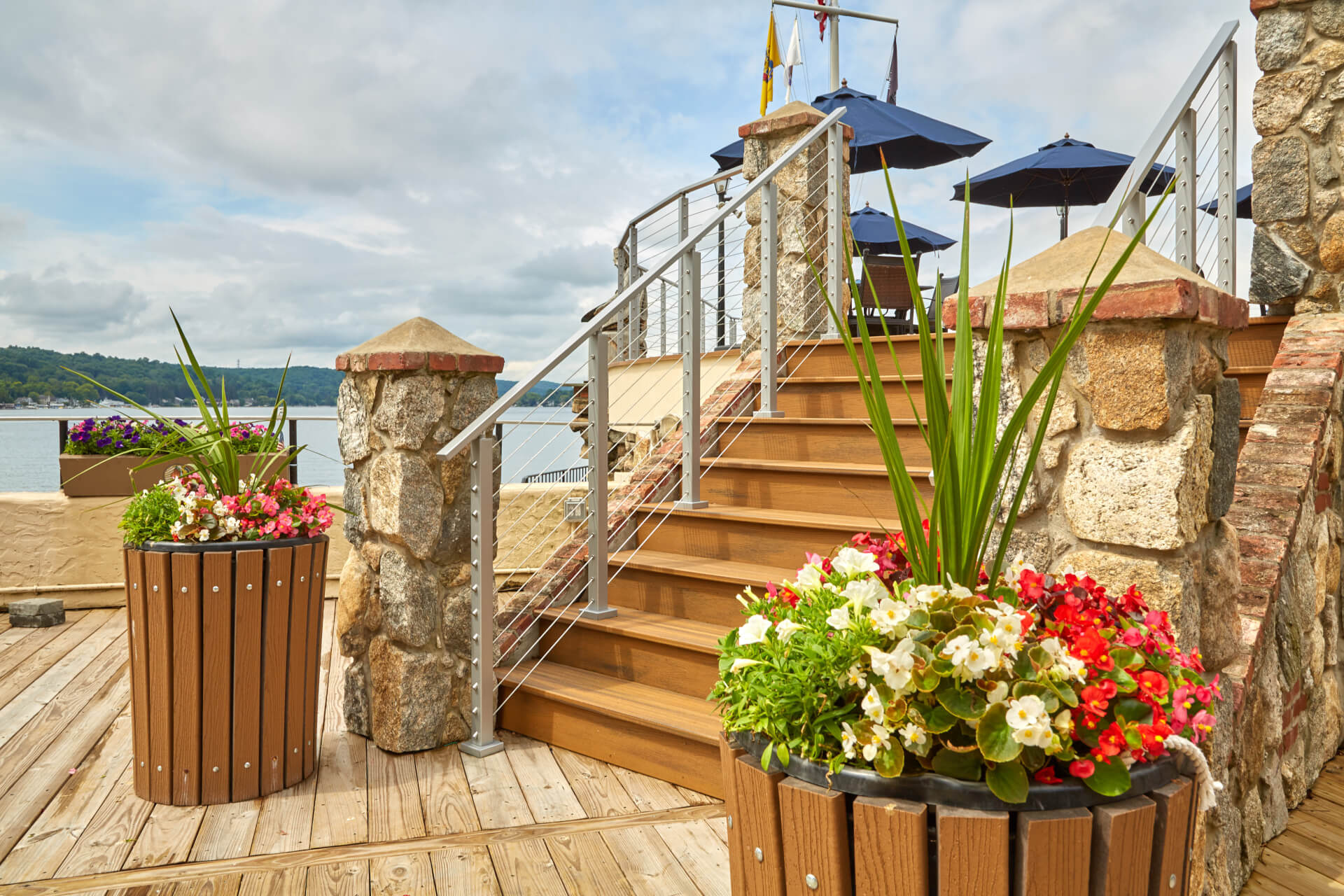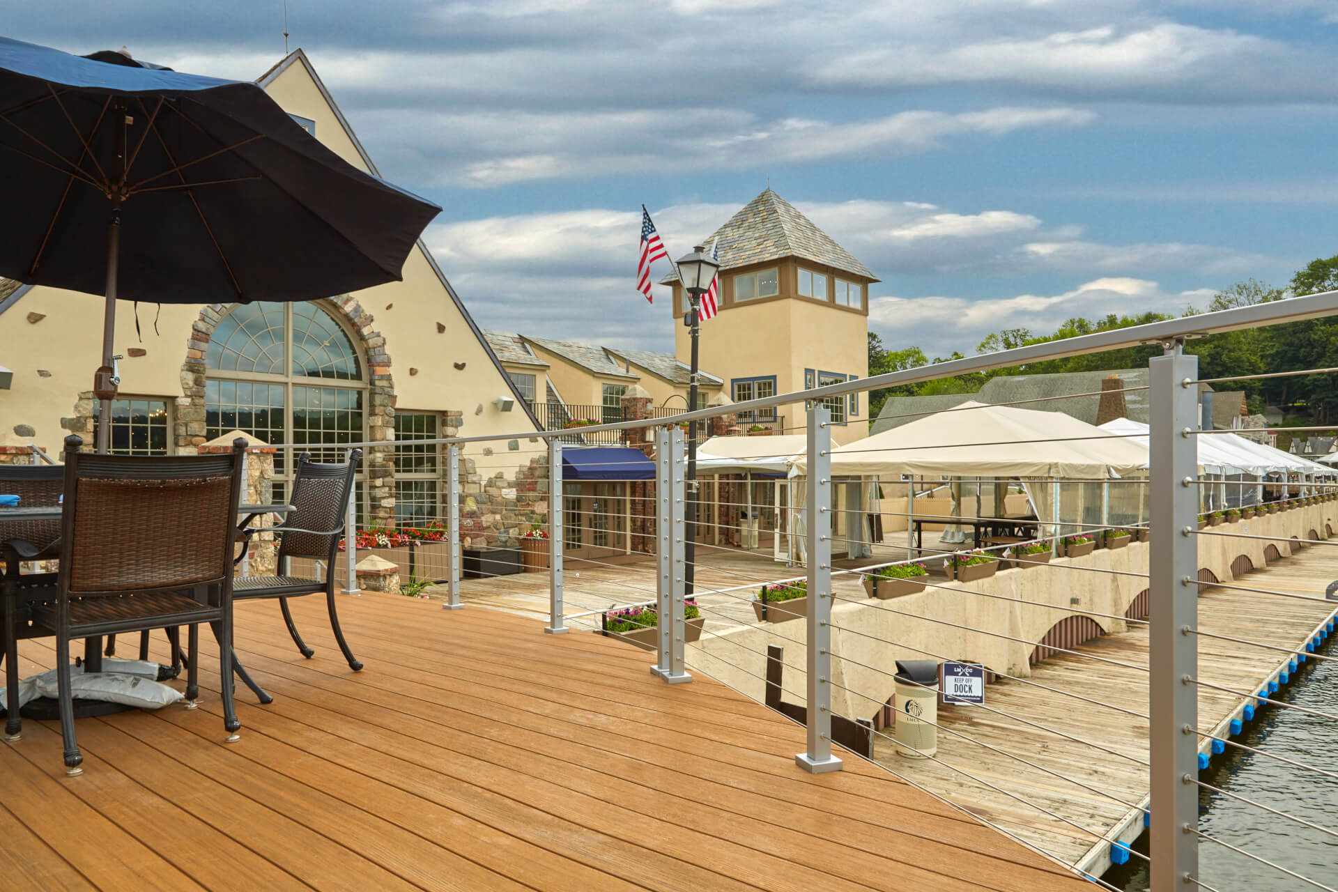 Products: Cable Railing, Signature Cable Railing, Curved Cable Railing on a Lakeside Restaurant