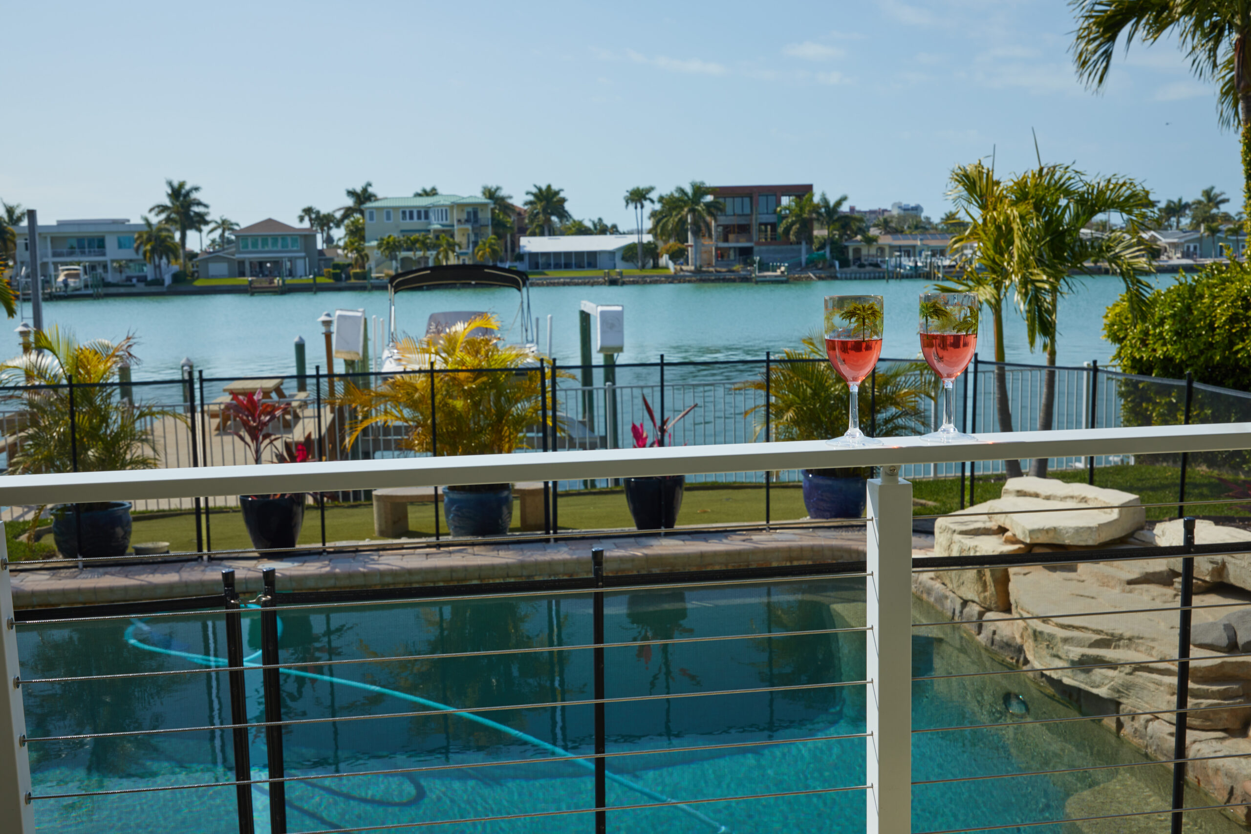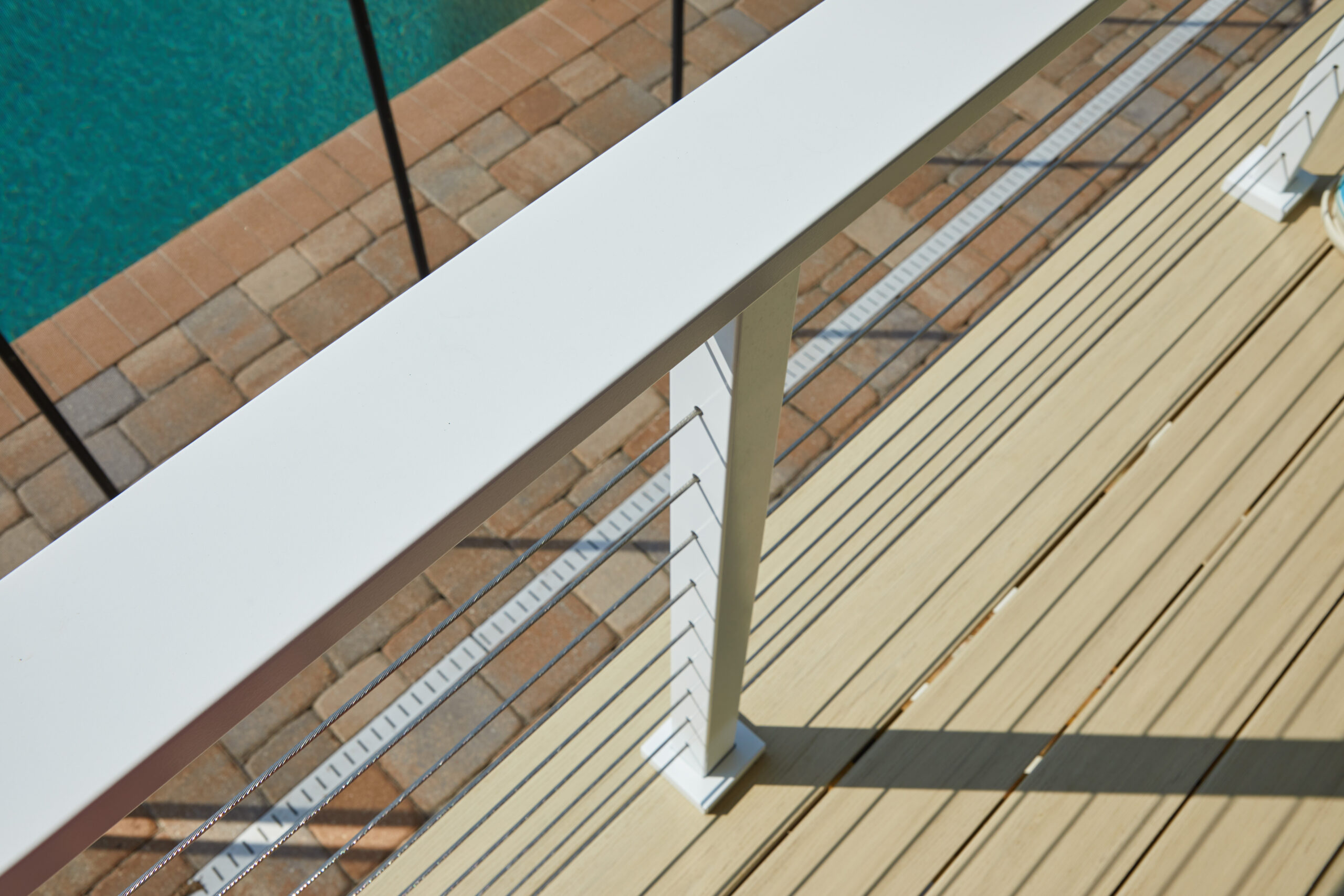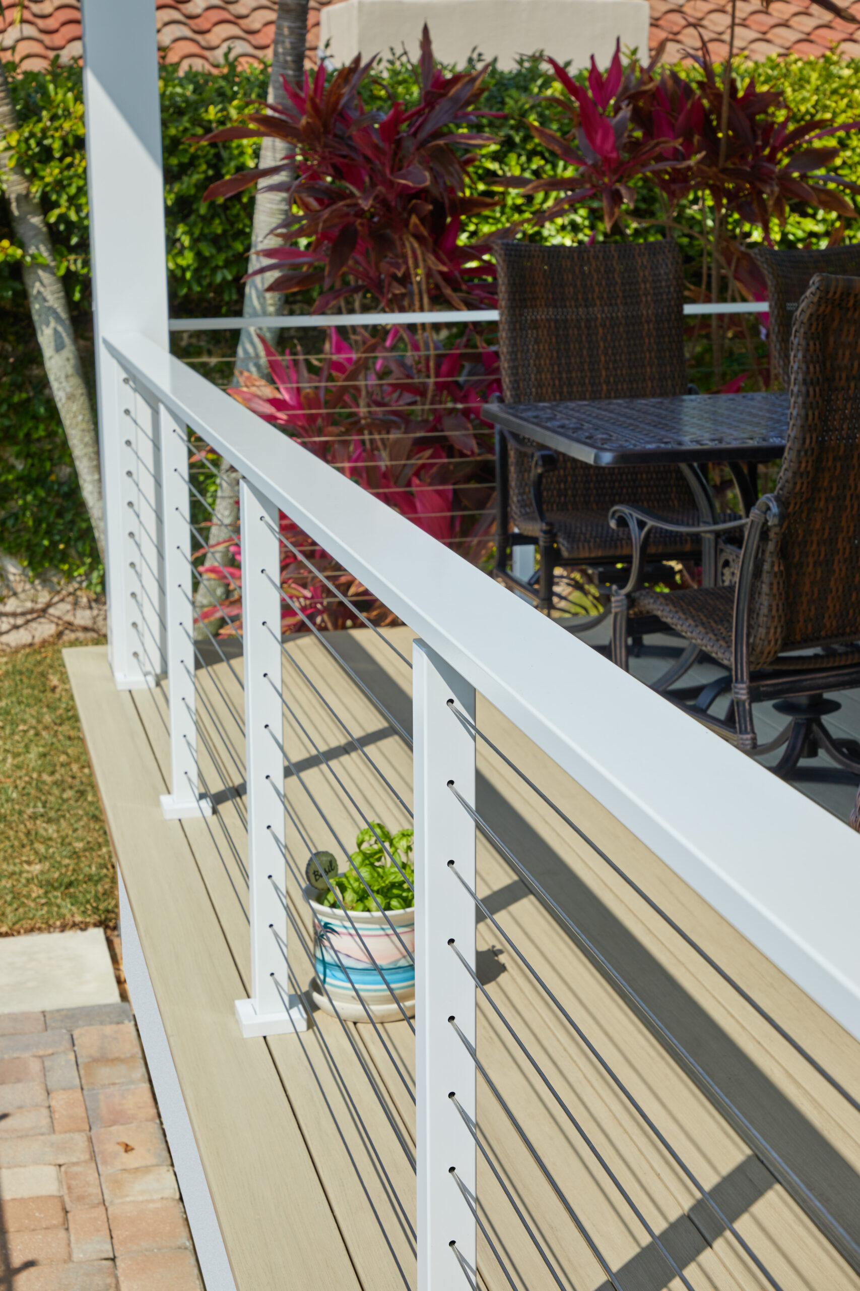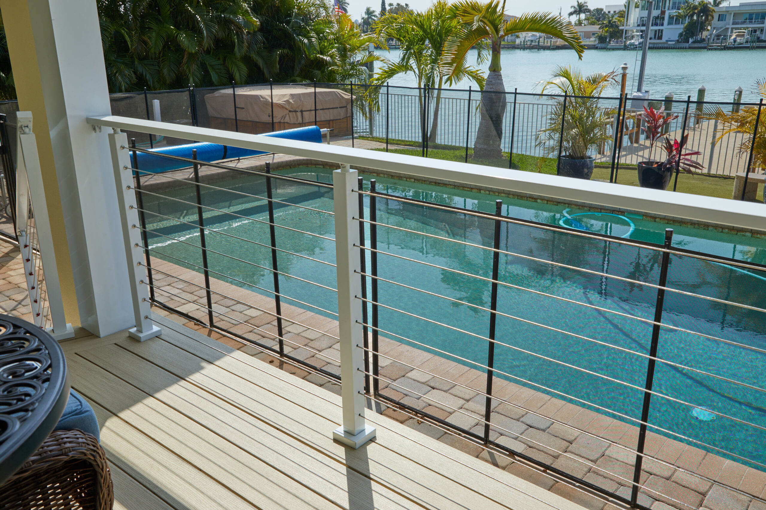 This Apollo White cable railing system blends in with the white trim color of the house and helps preserve the beautiful view of the water. Functional and strong, the beverage handrail provides a perfect place to set a drink down while leaning on or standing near the railing.
