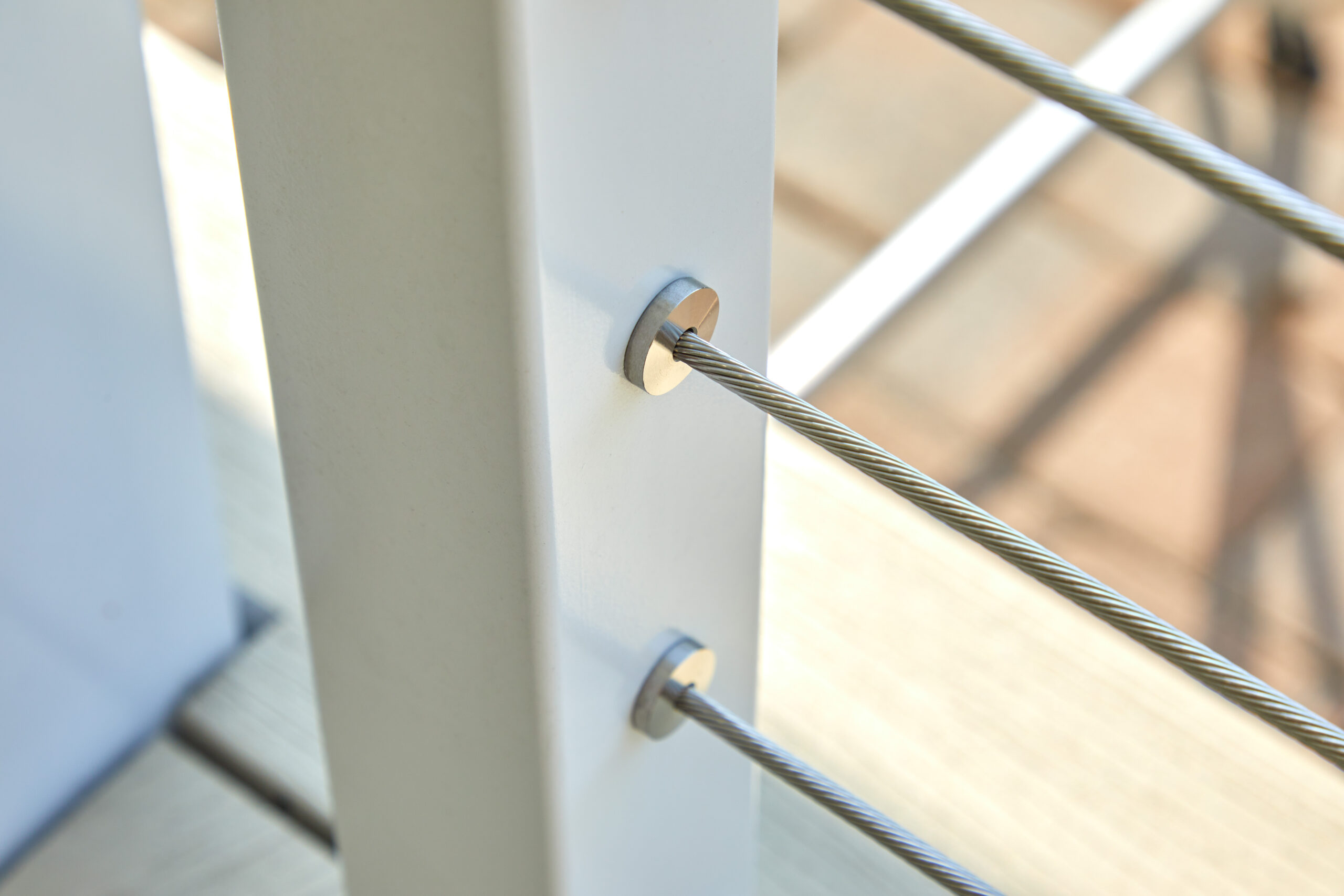 This Apollo White cable railing system blends in with the color of the house and preserves the beautiful view of the water.