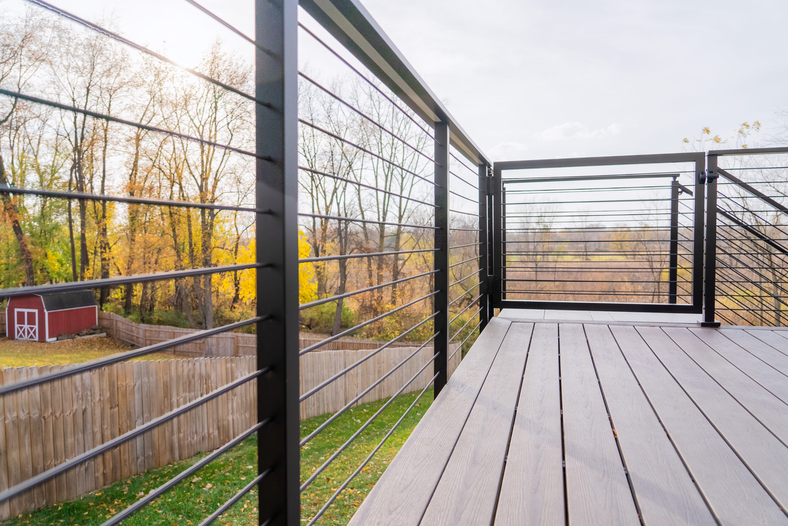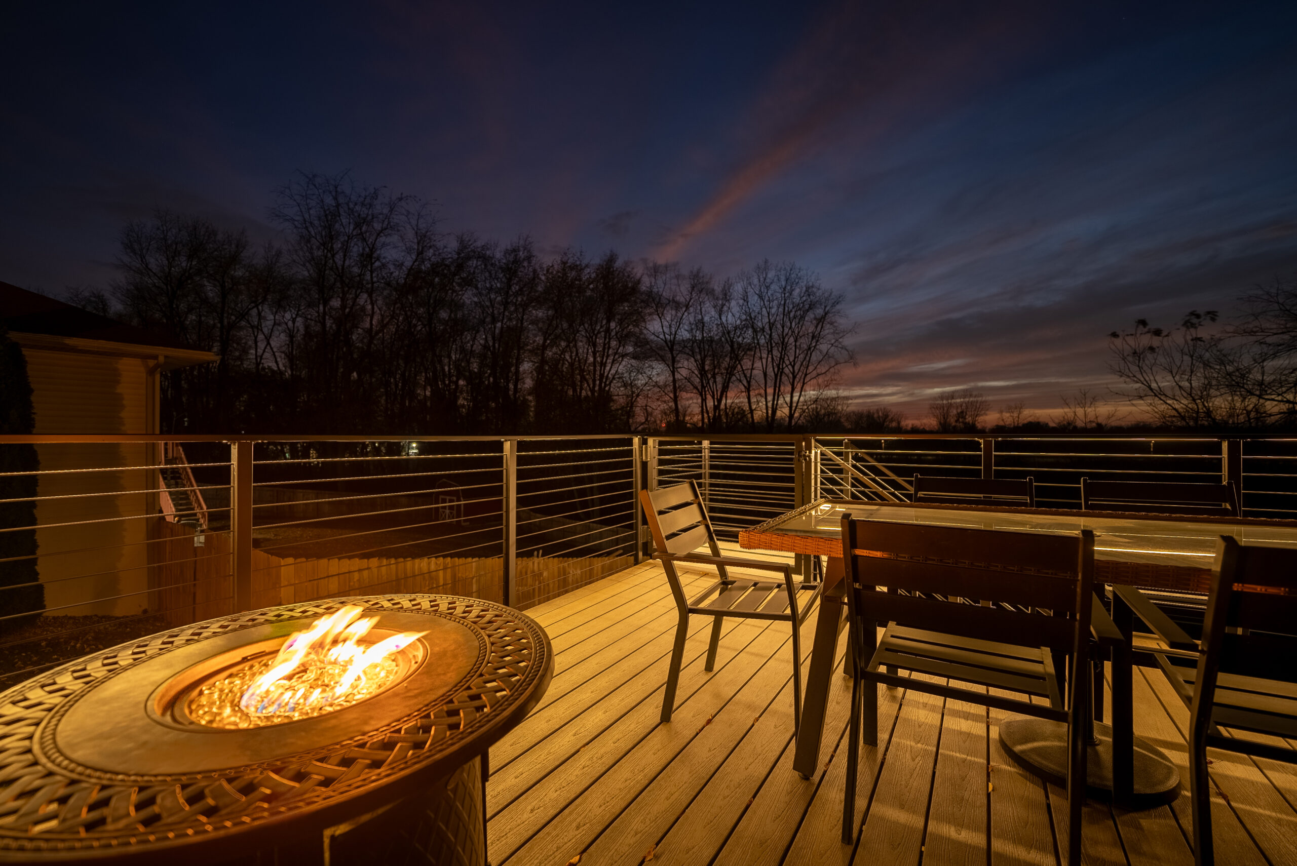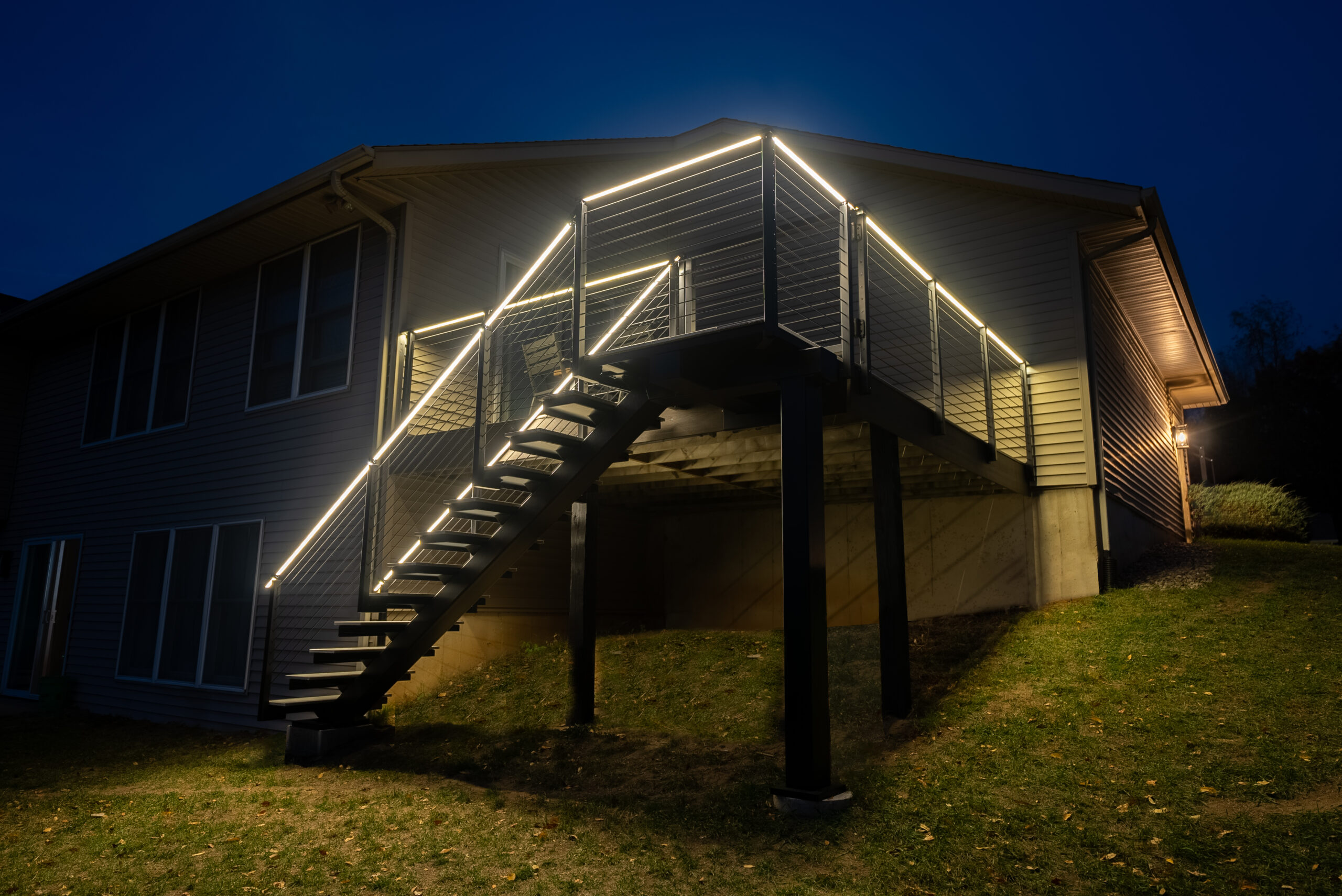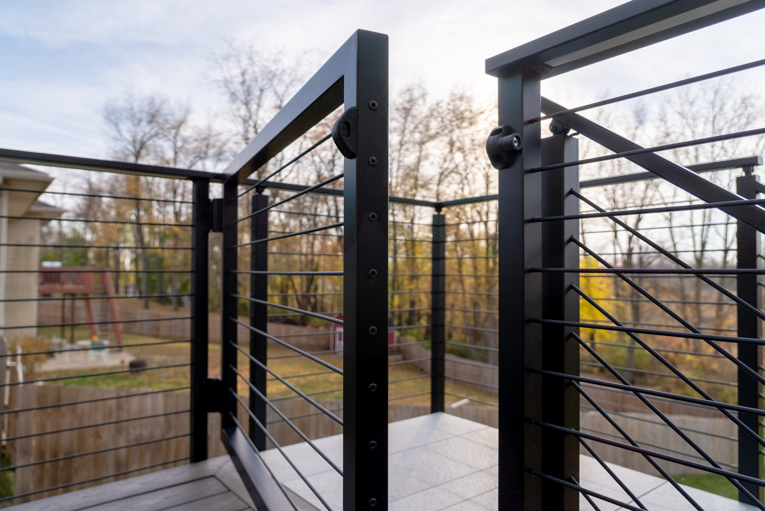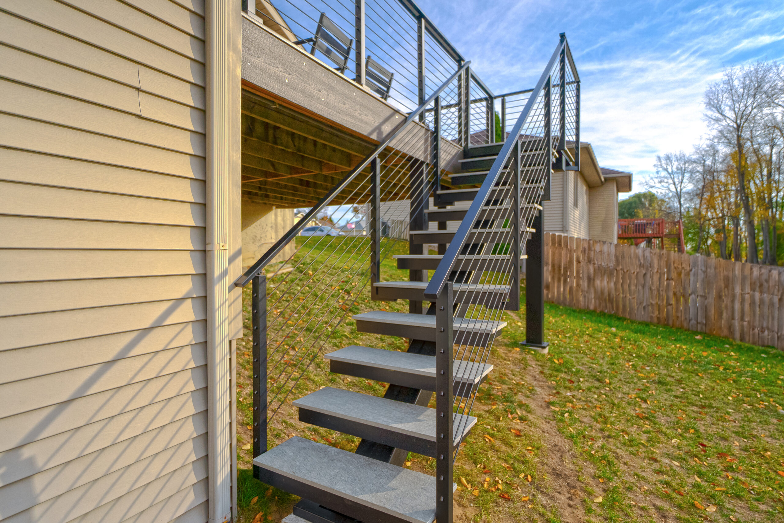 This deck was instantly elevated with a sleek cable railing system (featuring Onyx Rod Infill) and a FLIGHT Mono system with porcelain treads. These treads offer a low-maintenance, high-performance solution that elevates outdoor spaces with style and resilience.