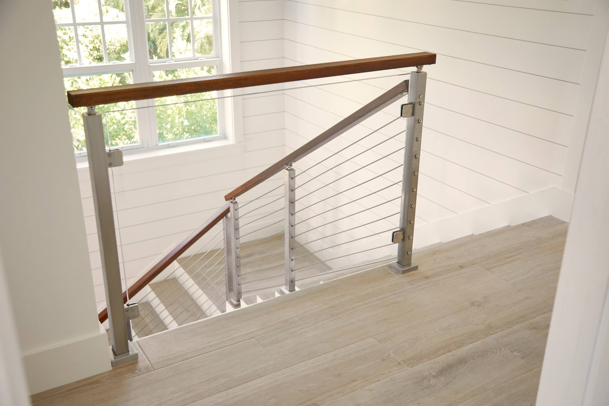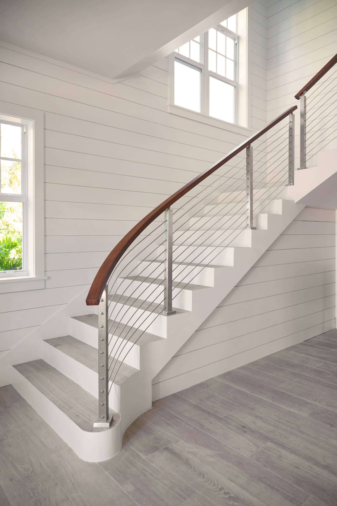 Rod Infill creates a classic yet contemporary look in this Florida home. Because rods can bend to turn a radius, they curve down these stairs in a sweeping, beautiful statement. At the top of the staircase, a single glass panel creates a mixed-materials look while maintaining open views. The tensioning technology of our posts allows all the hardware to be hidden away inside. All you see are the sleek, minimal lines of the system.