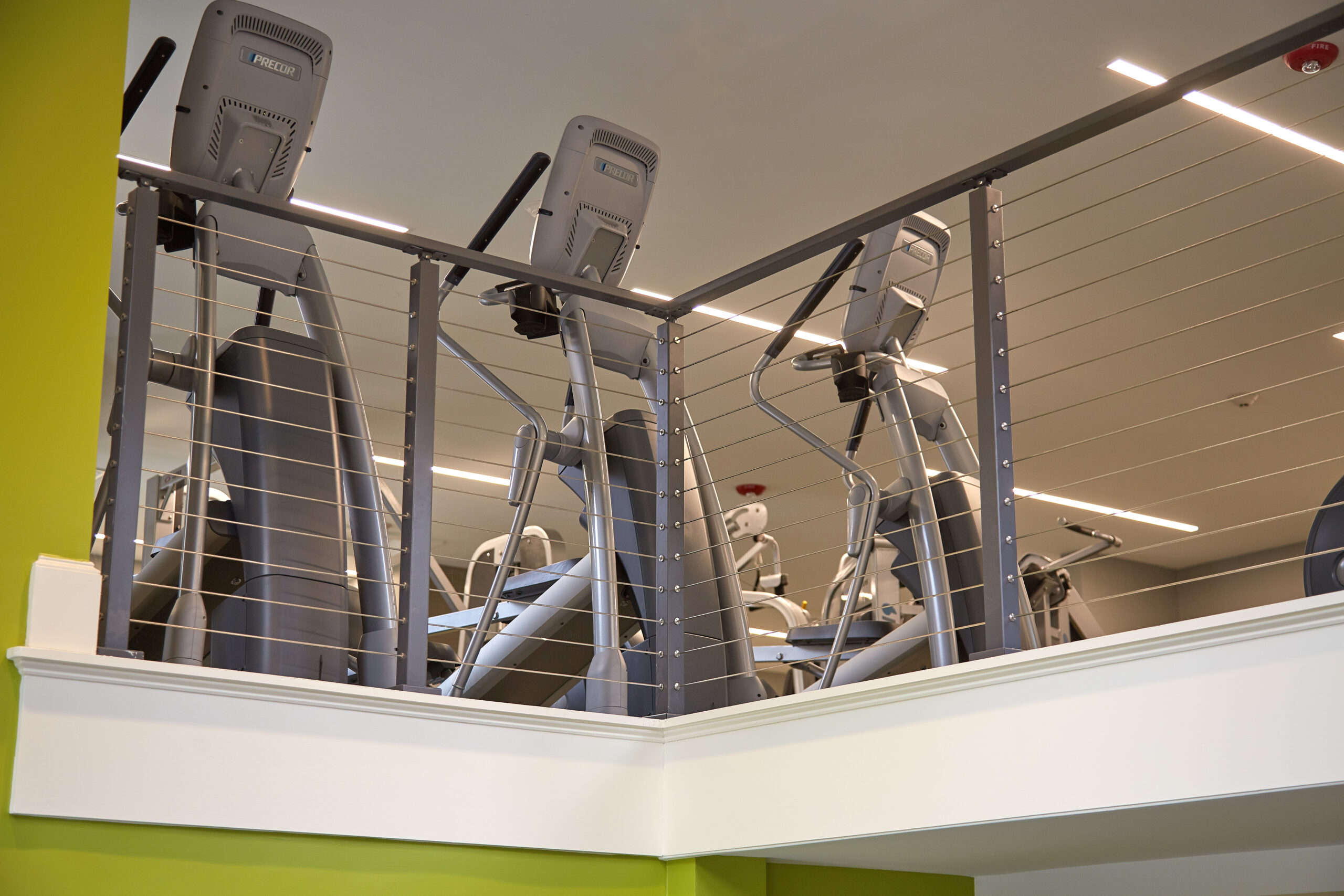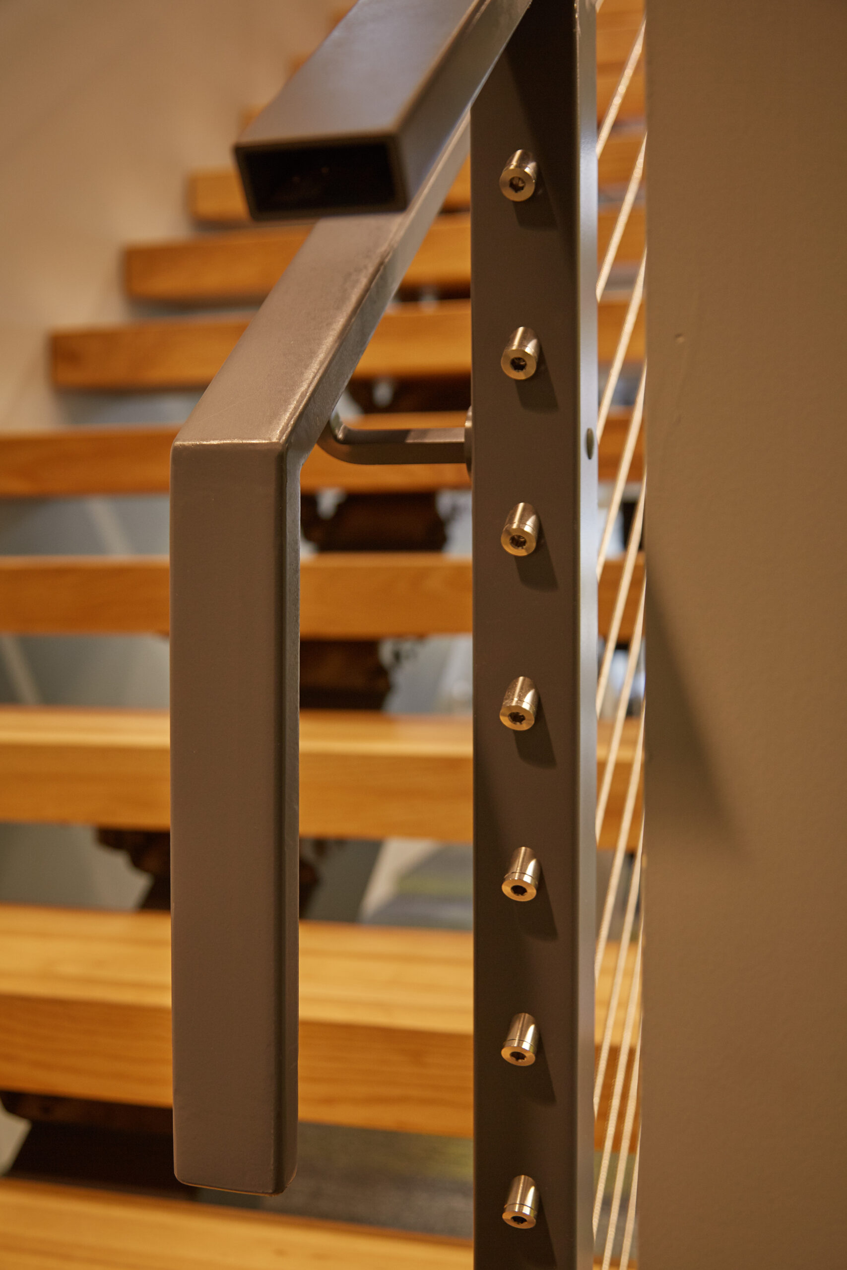 These floating stairs with thick stair treads in ash makes an elegant, sturdy centerpiece in this workout facility in New Hampshire. The aluminum handrails, graspable handrail, and posts pair nicely with the metal workout equipment, and the cable railing keeps the views on the second floor open. These stairs will last through years of people’s trips to the gym thanks to the strength of our FLIGHT Mono Stringer and its components.