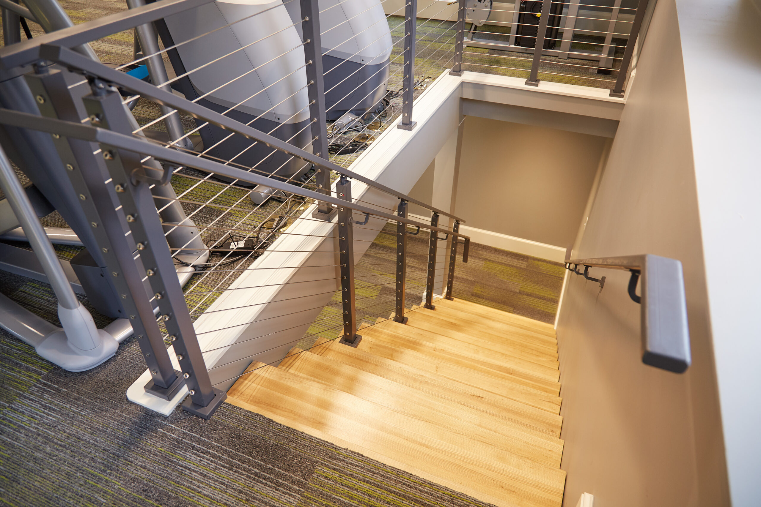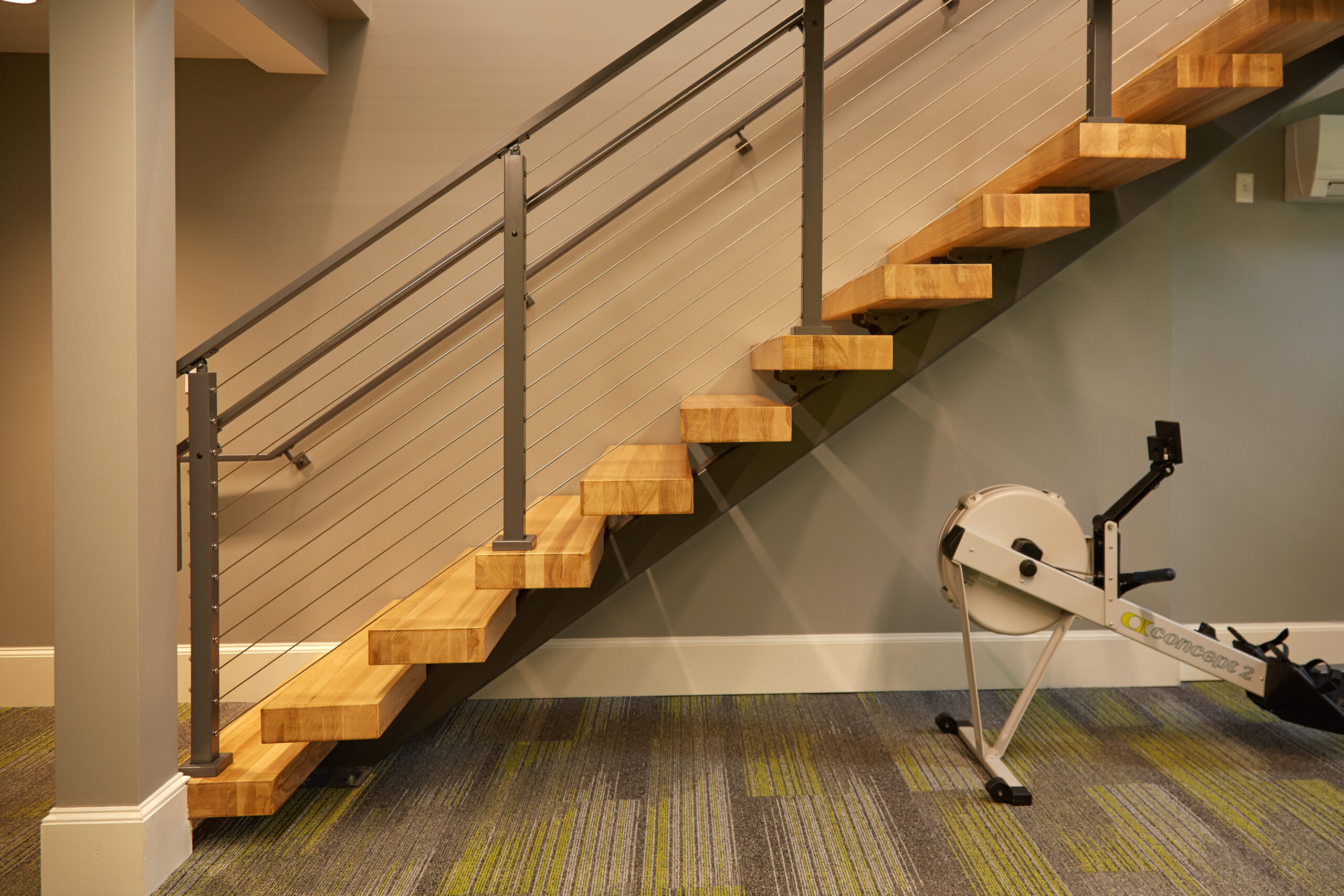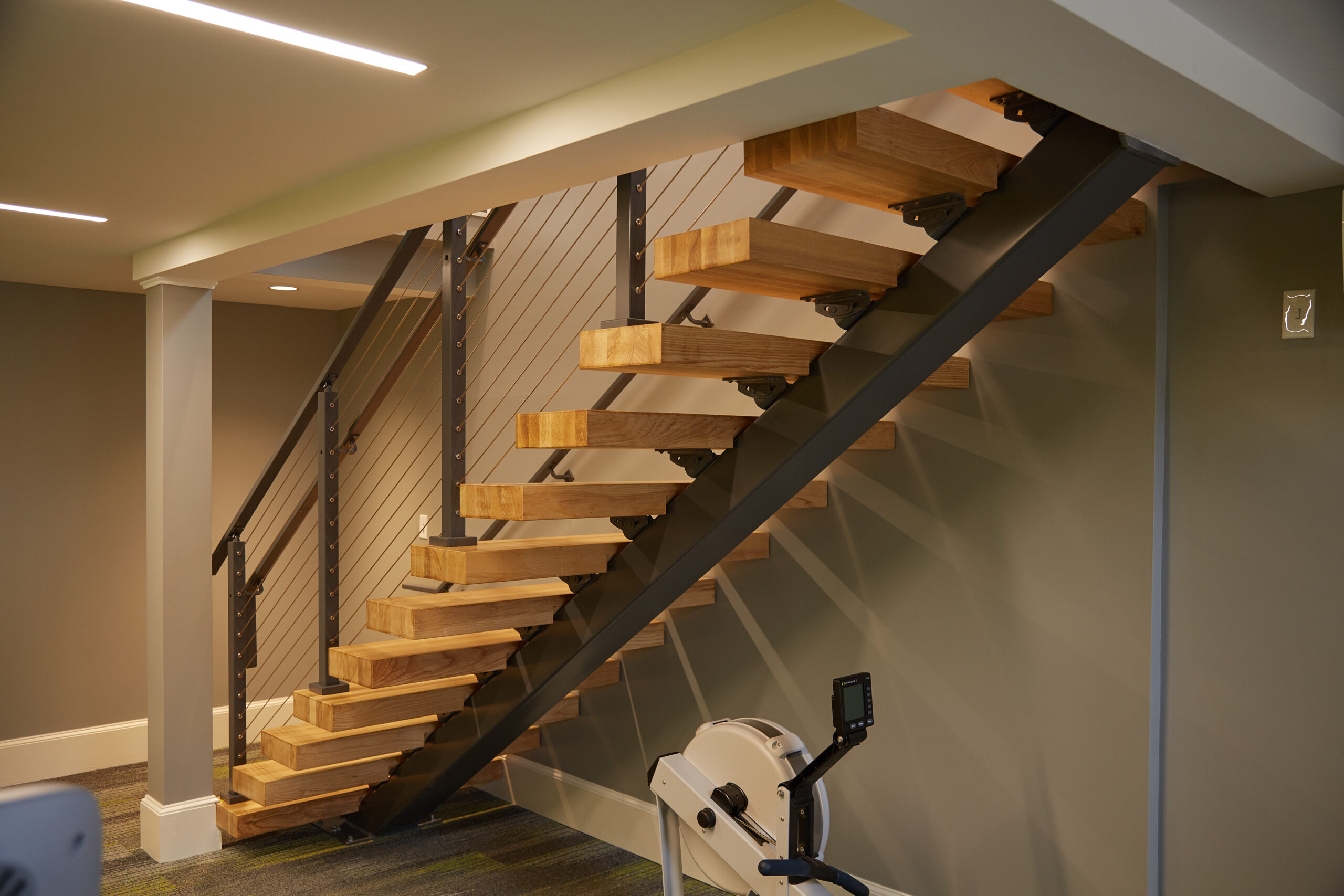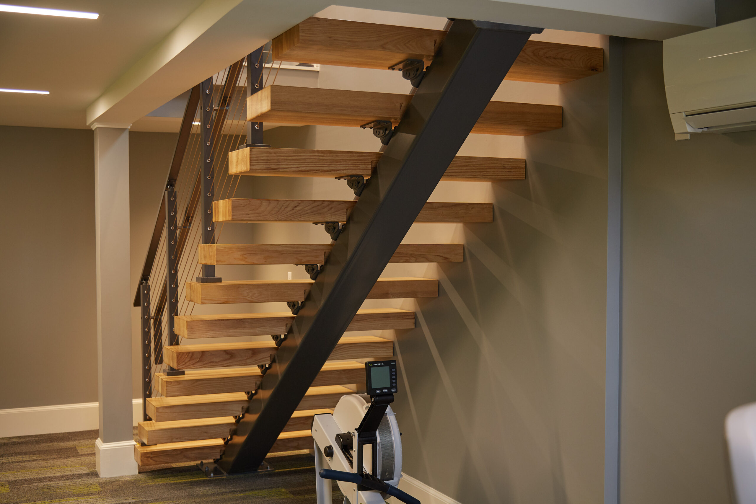 These floating stairs with thick stair treads in ash makes an elegant, sturdy centerpiece in this workout facility in New Hampshire.