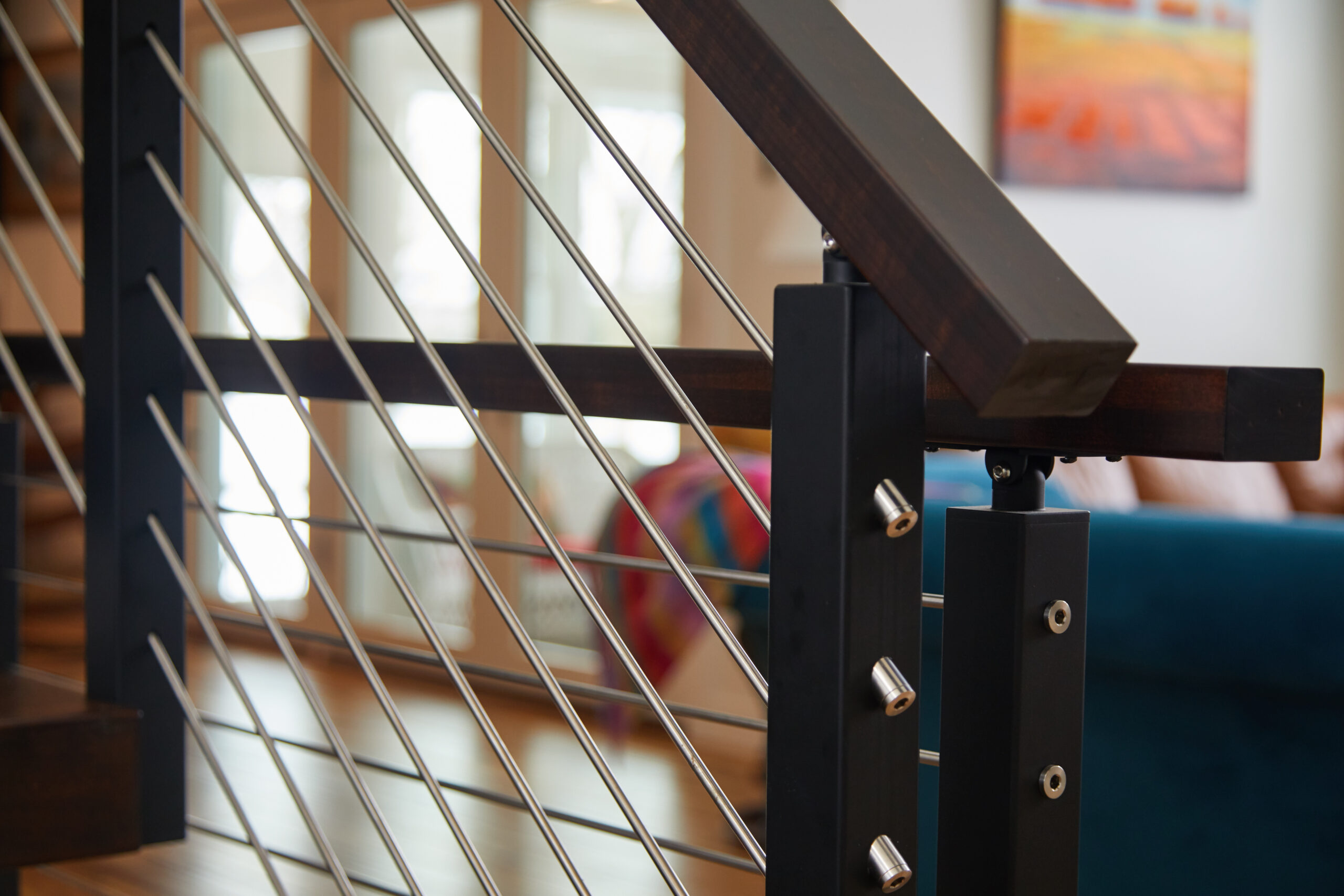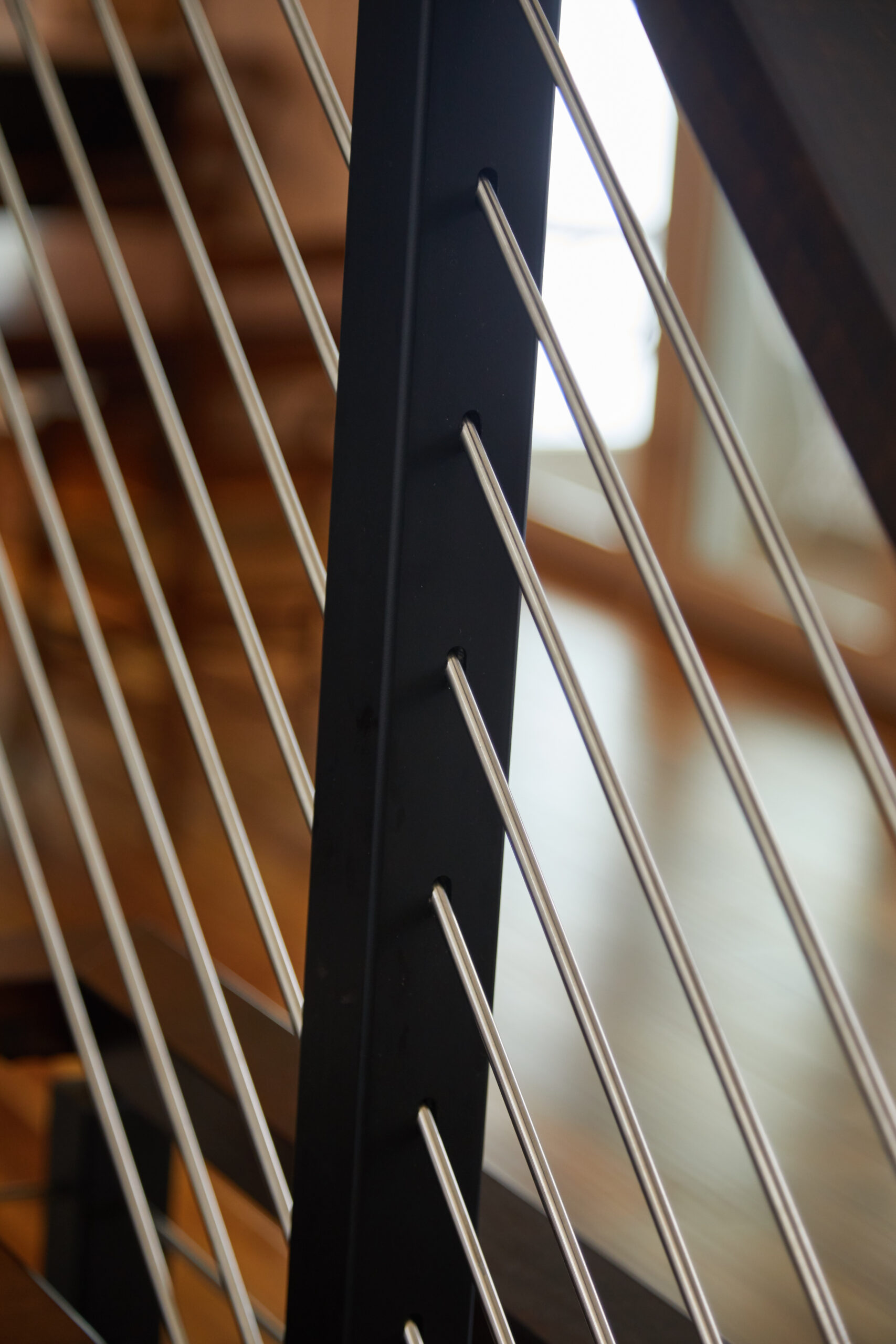 The railing install was just as simple. We used tread side mount posts on either end of the tread — keeping the steps wide open so guests can easily traverse the staircase. Paired with the slender lines of rod railing, the finished look is minimal, open, and fresh.