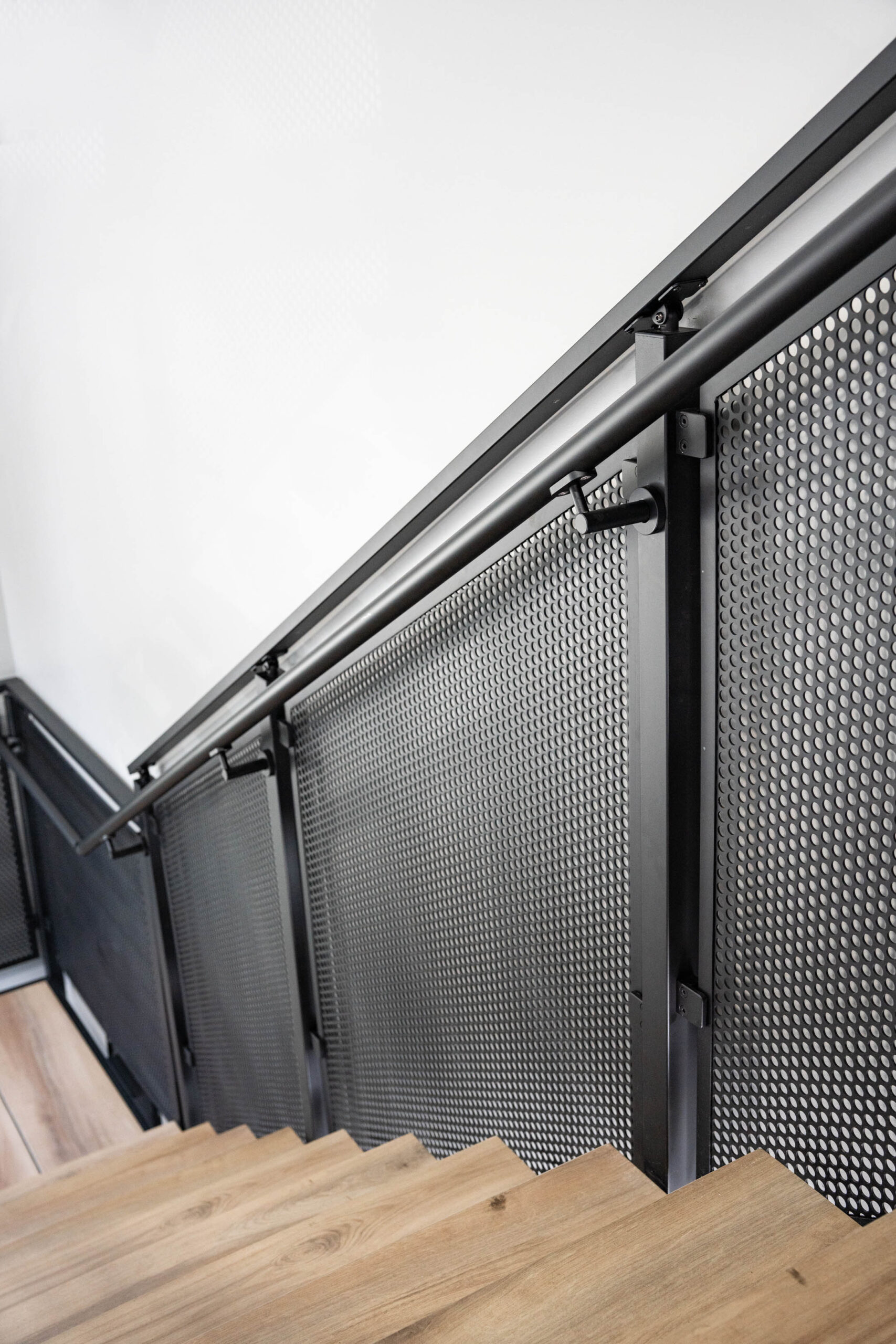 Floating Stairs with Porcelain Treads and Perforated Railing Panels