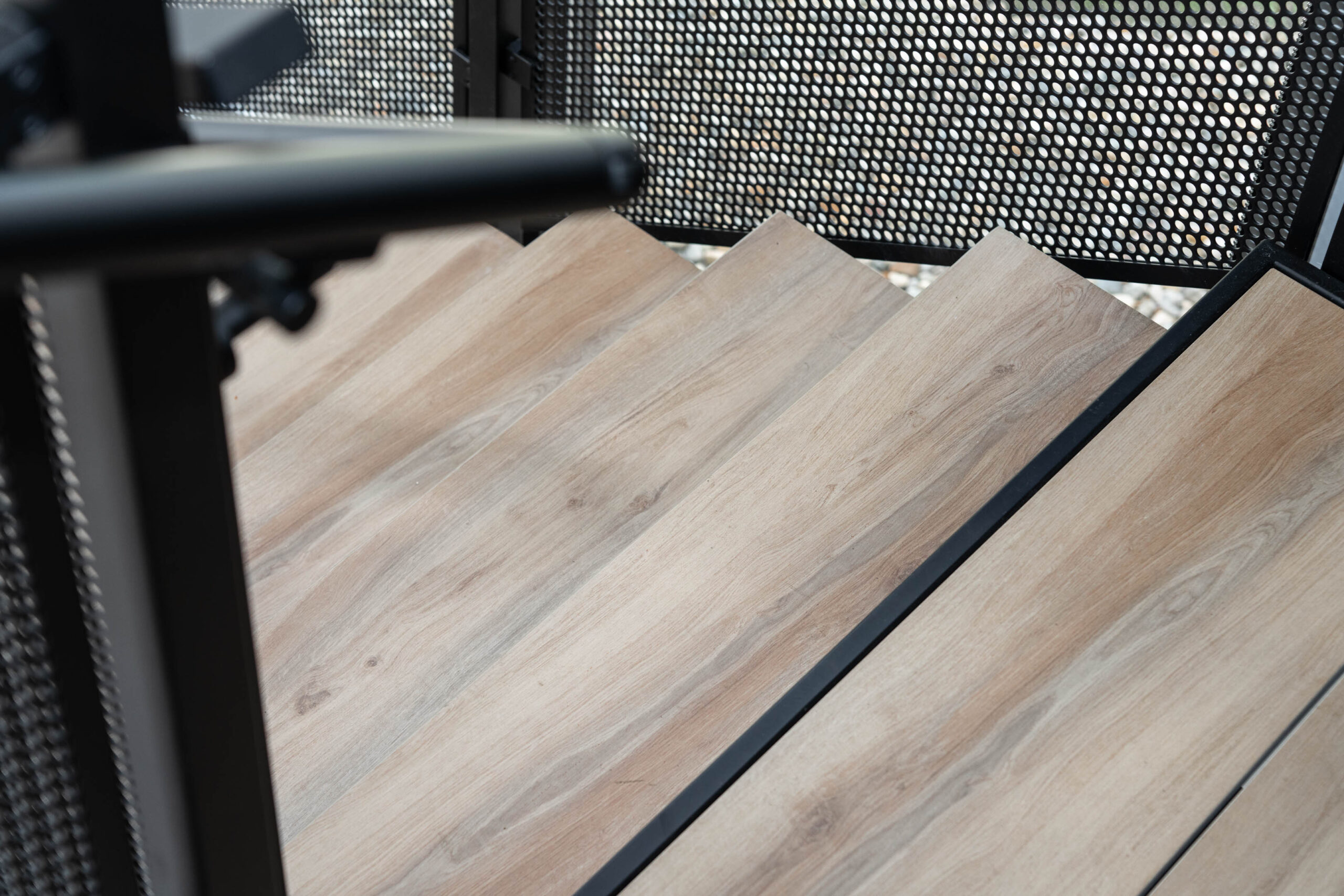 Products: FLIGHT Floating Stairs, FLIGHT Mono, Floating Stairs with Porcelain Treads and Perforated Railing Panels