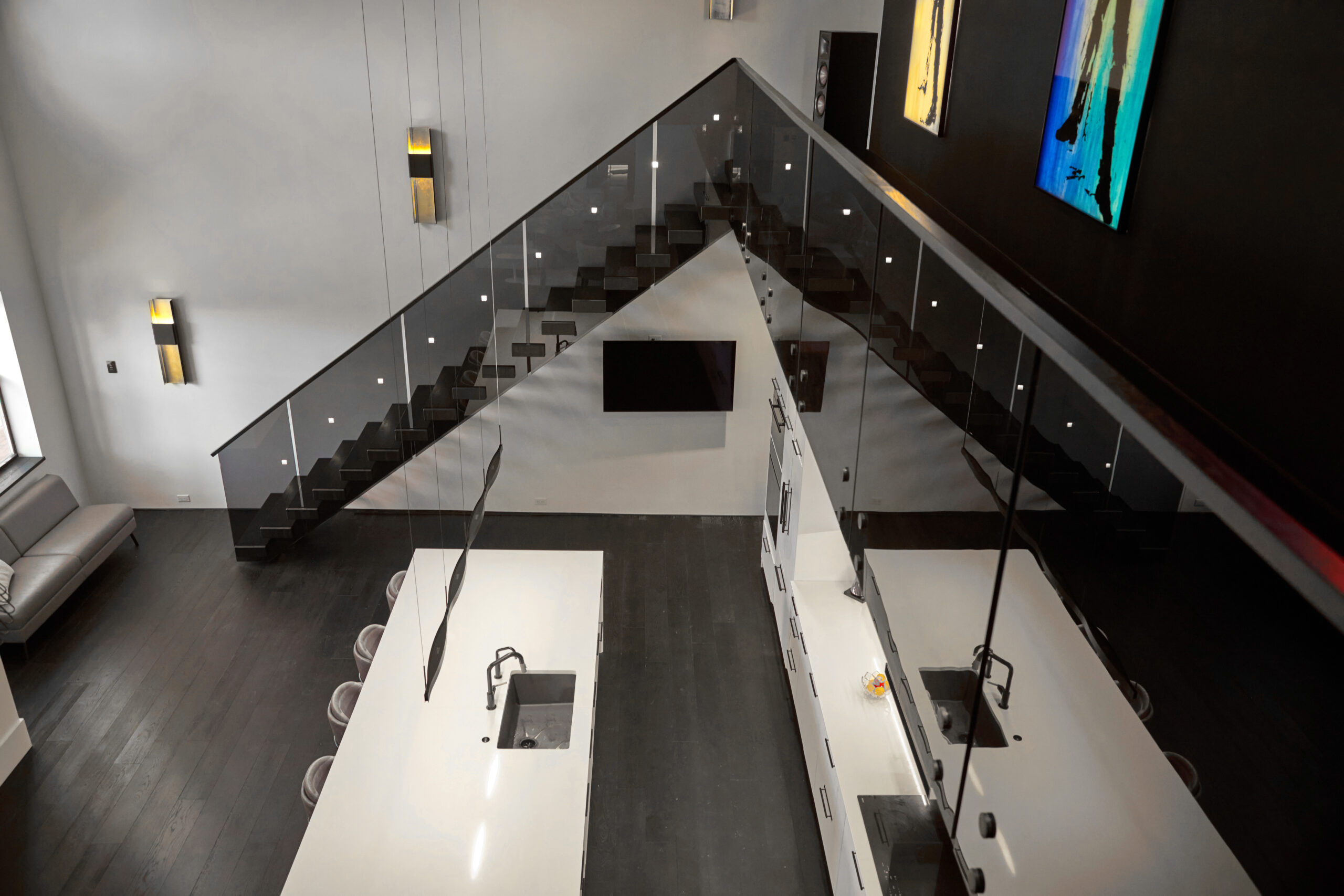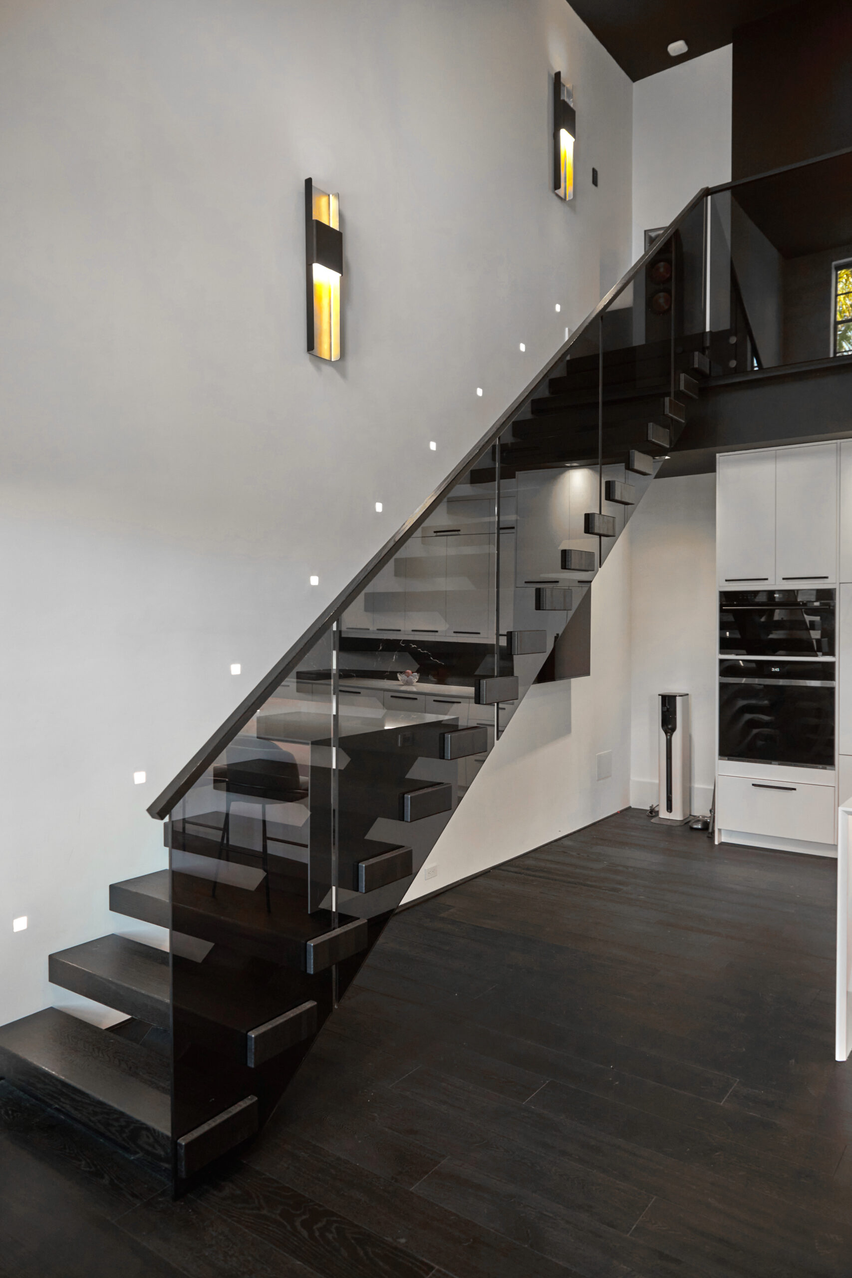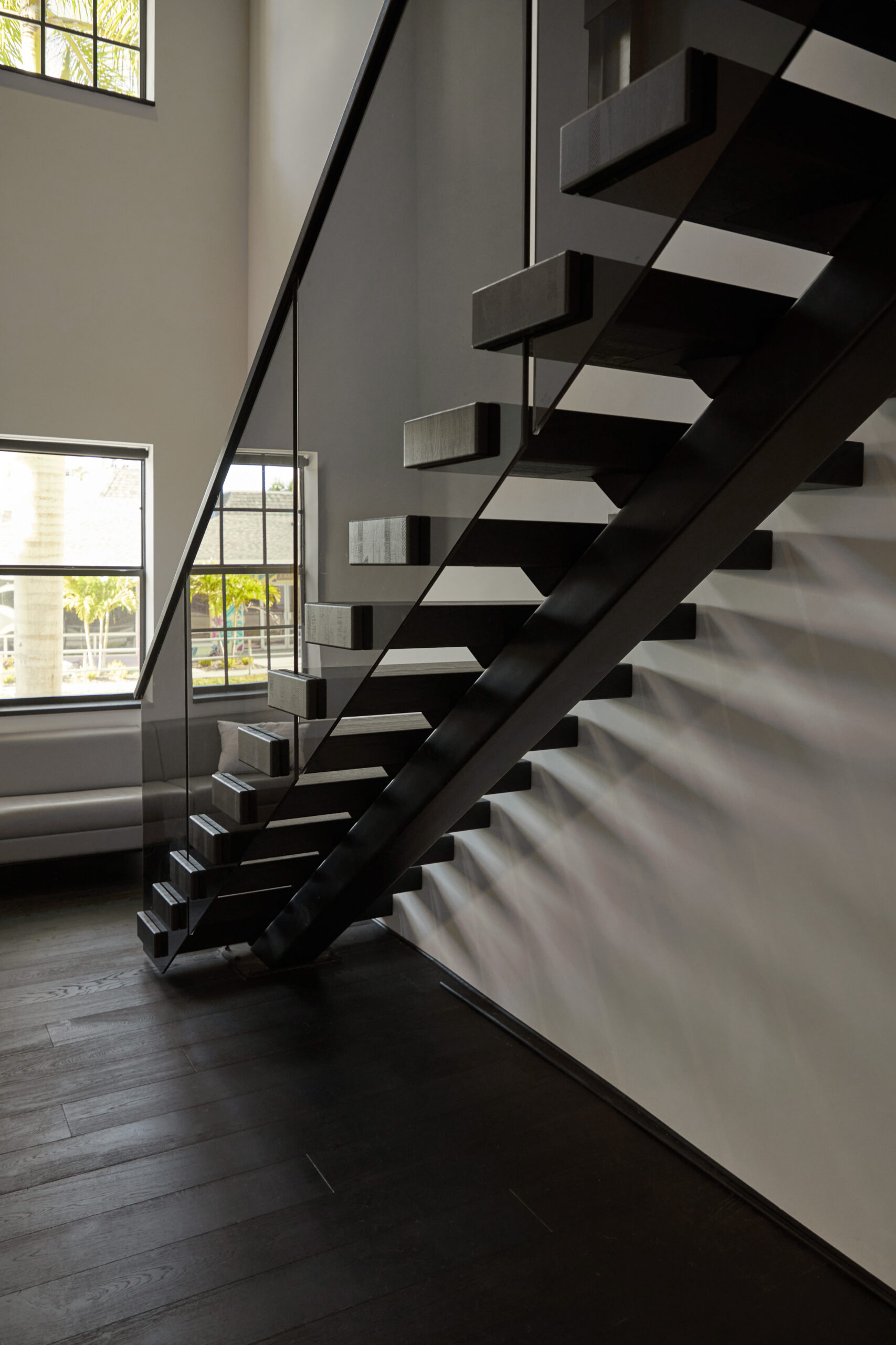 Products: FLIGHT Floating Stairs, FLIGHT Mono, Glass Railing, Standoff Pins, Vedera, Solar Gray FLIGHT Mono System in Fort Myers