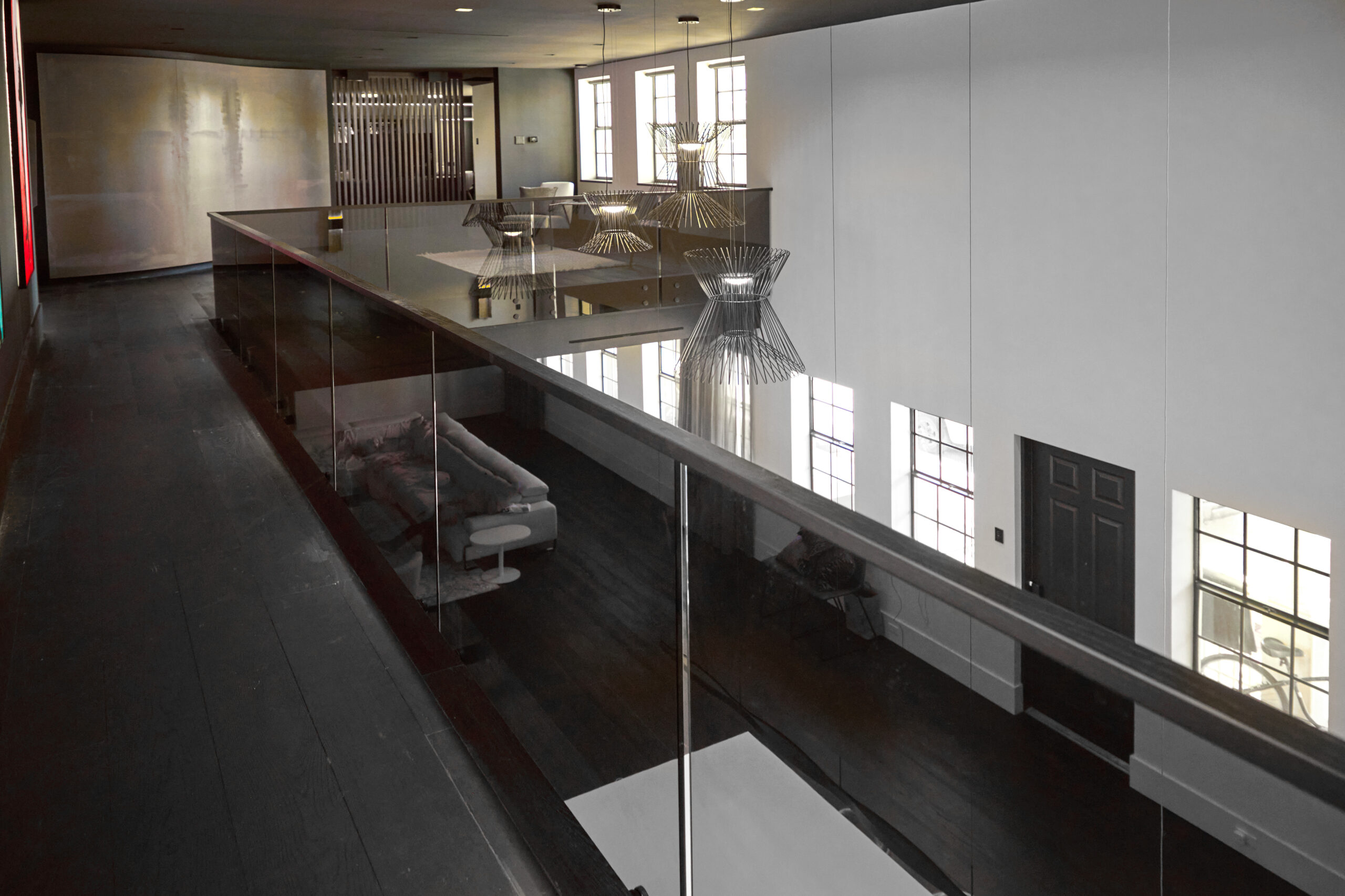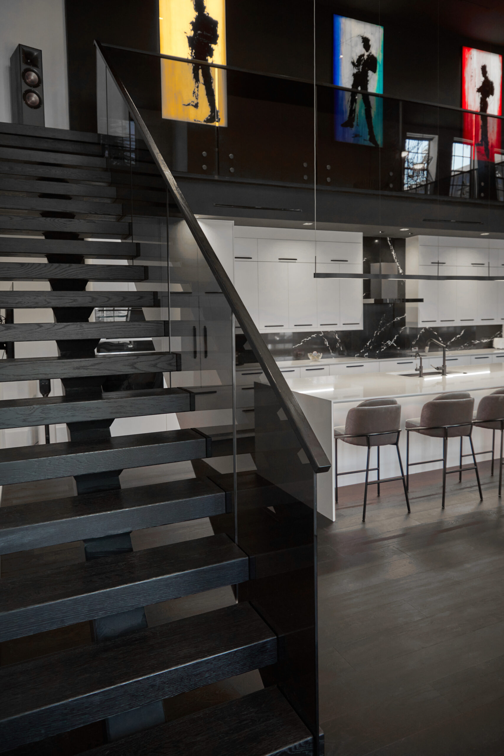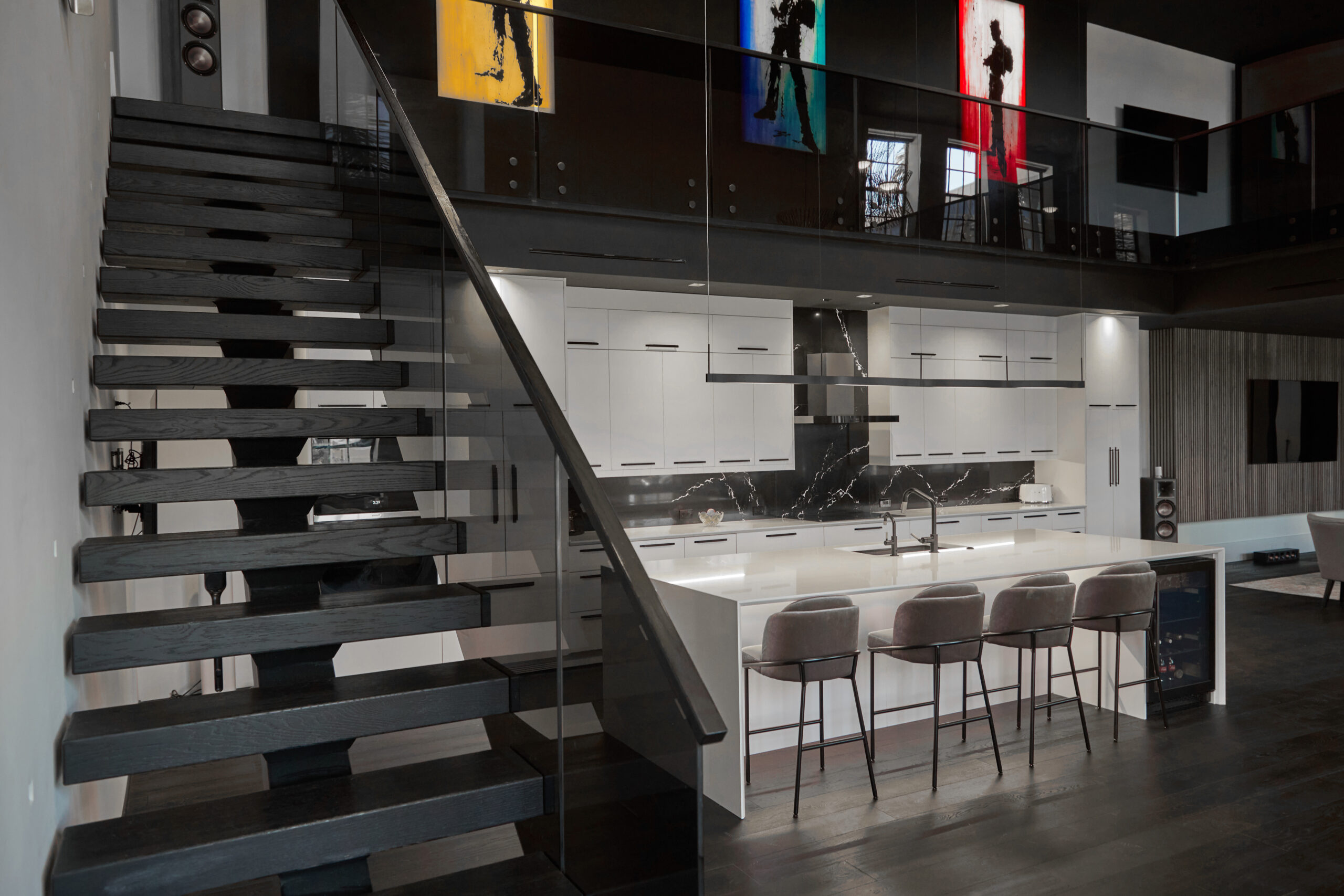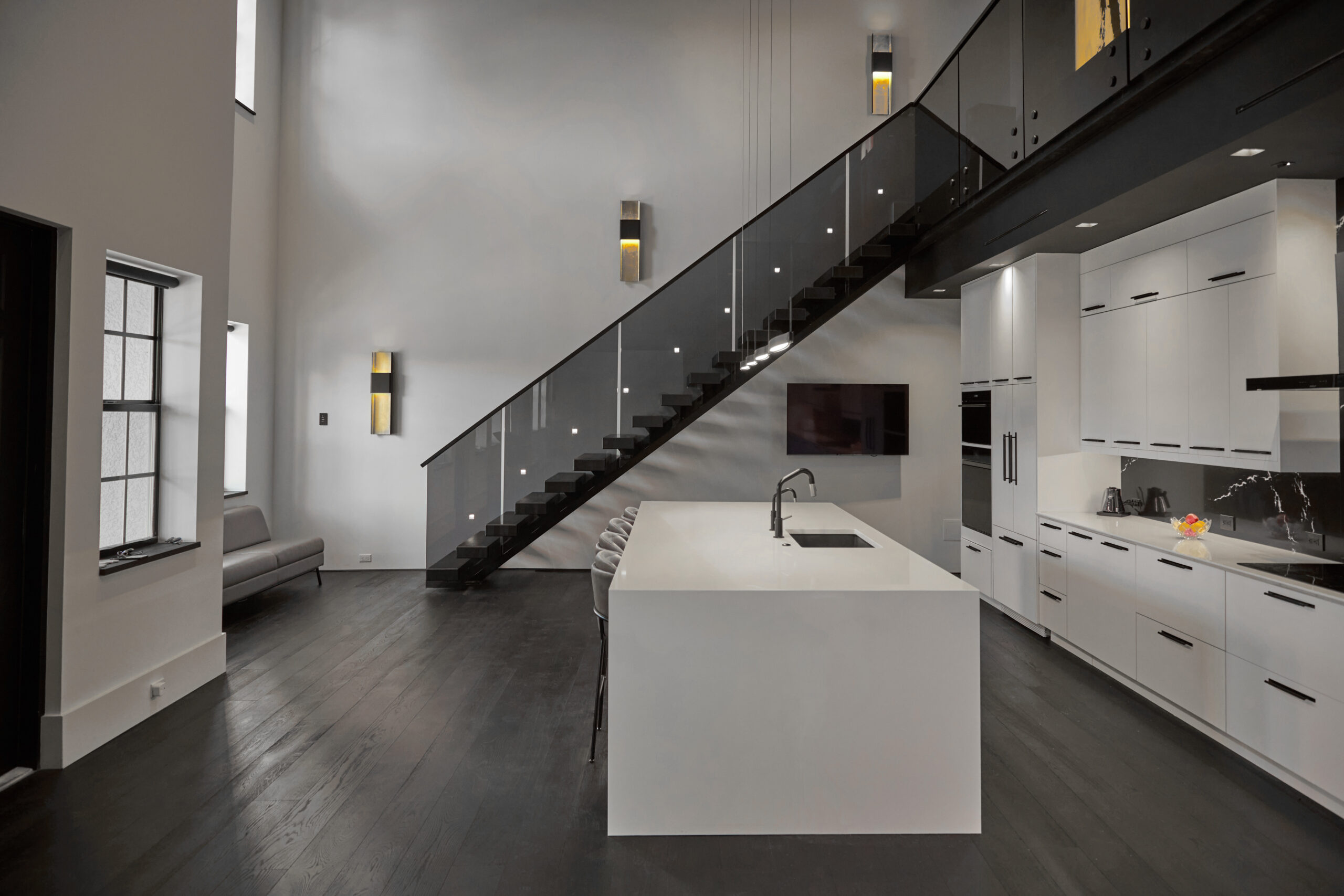 Products: FLIGHT Floating Stairs, FLIGHT Mono, Glass Railing, Standoff Pins, Vedera, Solar Gray FLIGHT Mono System in Fort Myers