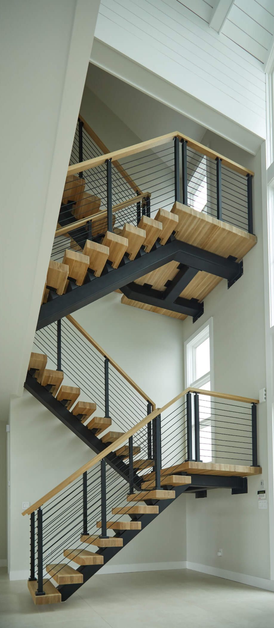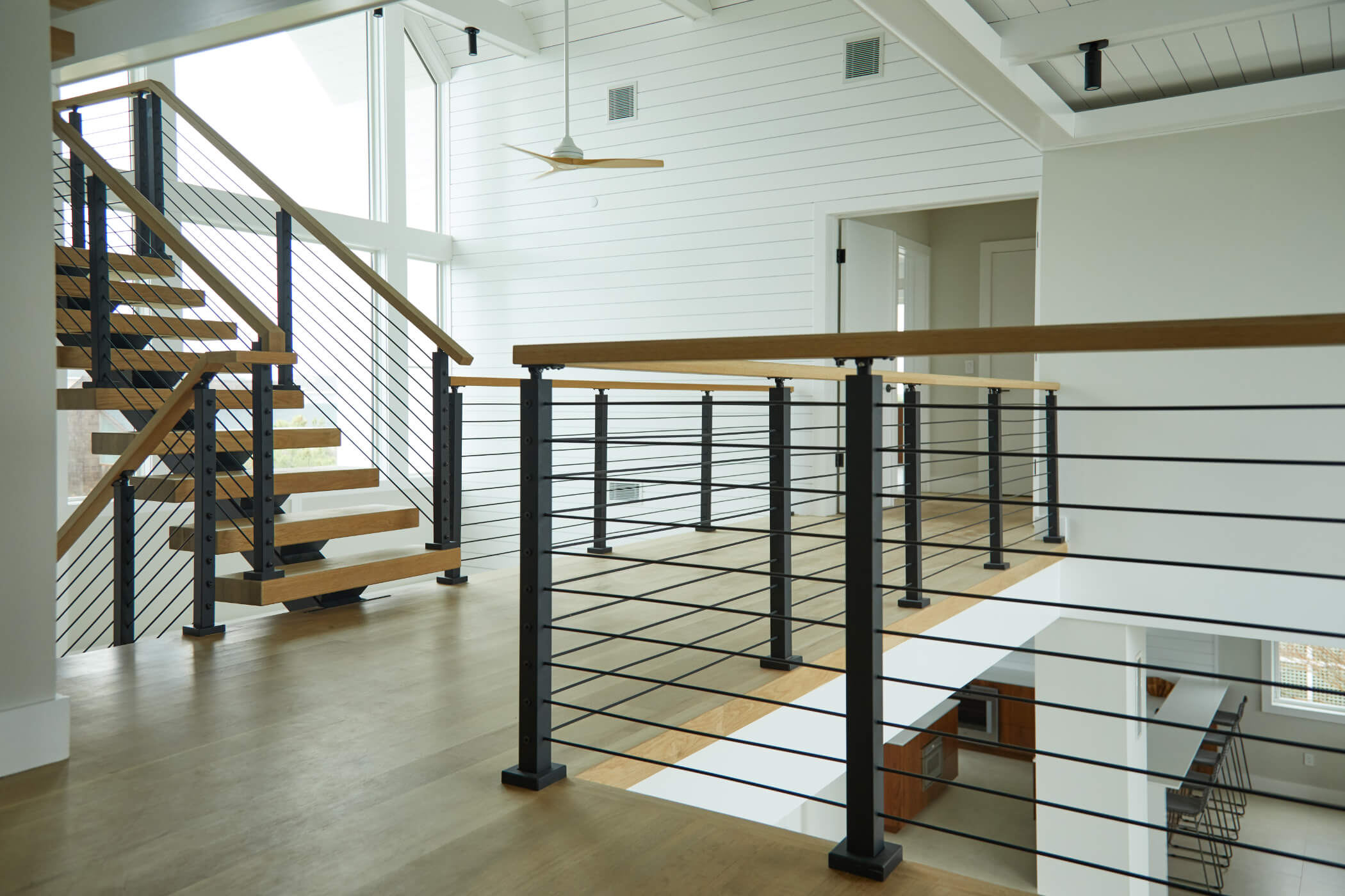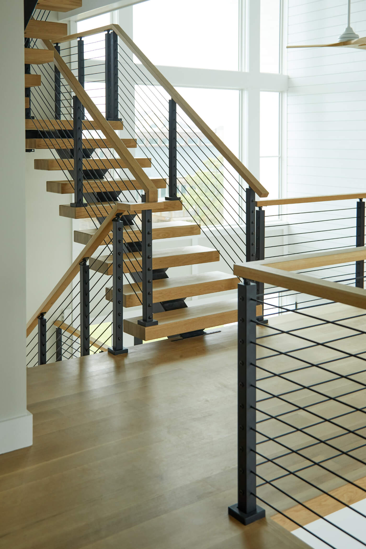 Products: Cable Railing, FLIGHT Floating Stairs, FLIGHT Mono, Onyx Rod Infill, Signature Cable Railing, Floating Switchback Stairs for a Westhampton Home