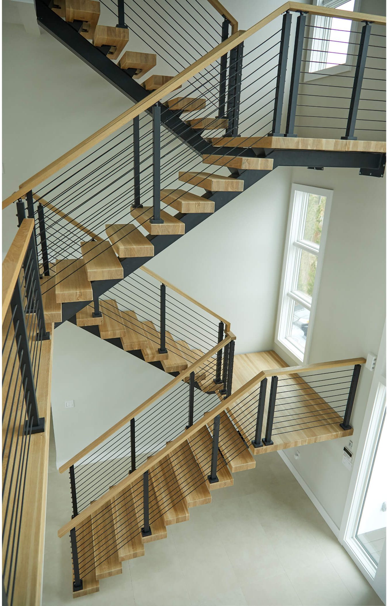 The owners of this home in Westhampton, New York chose to install a switchback floating staircase to transition from one floor to another.