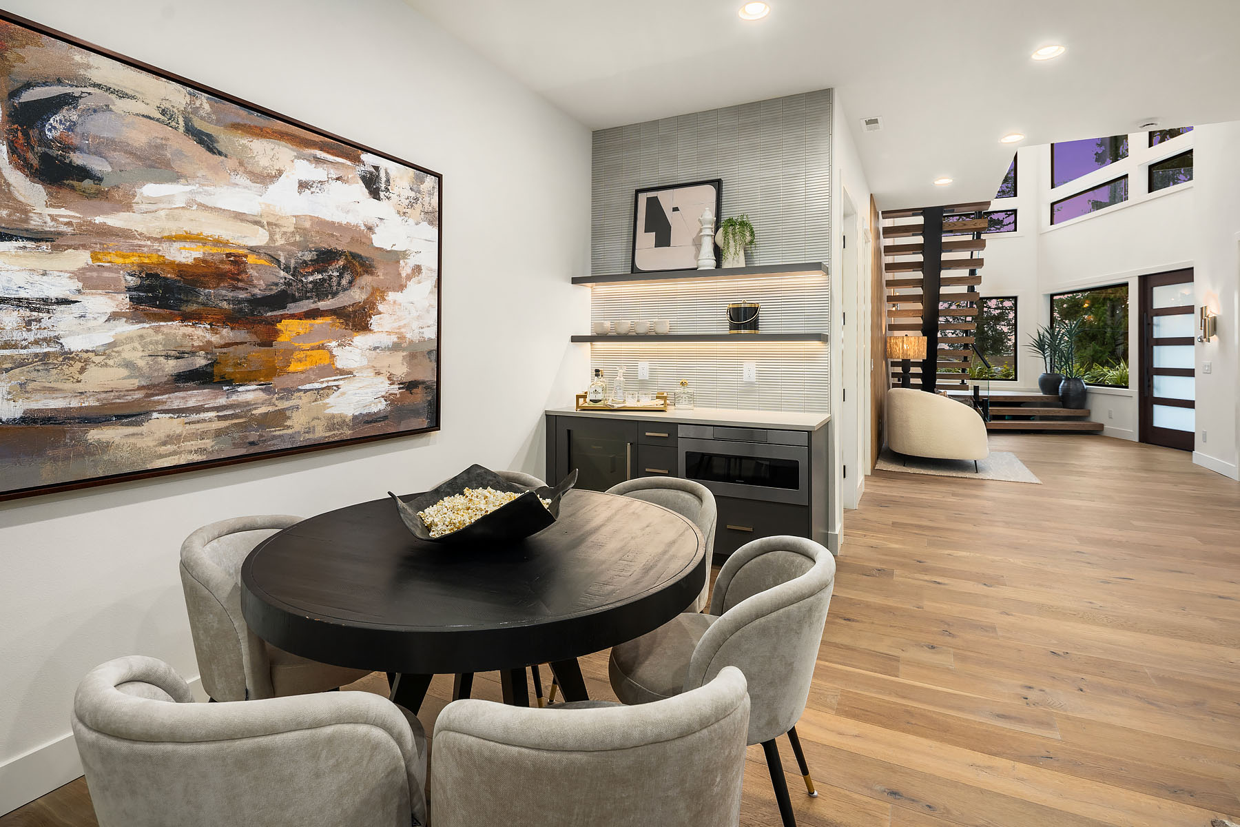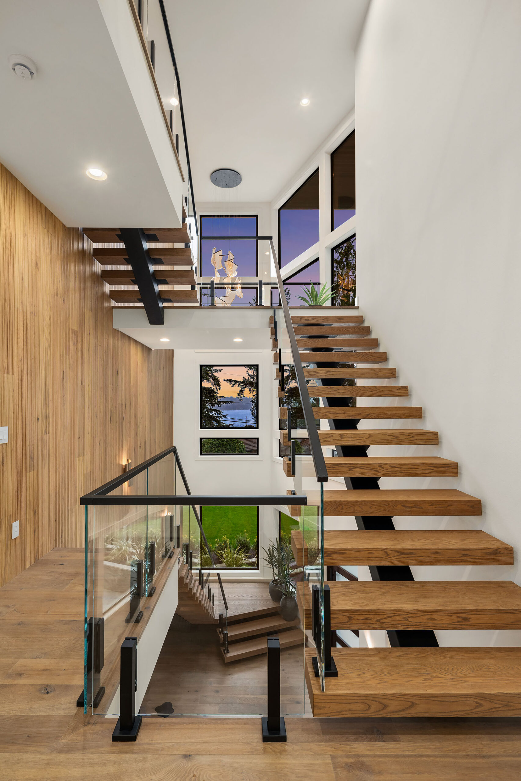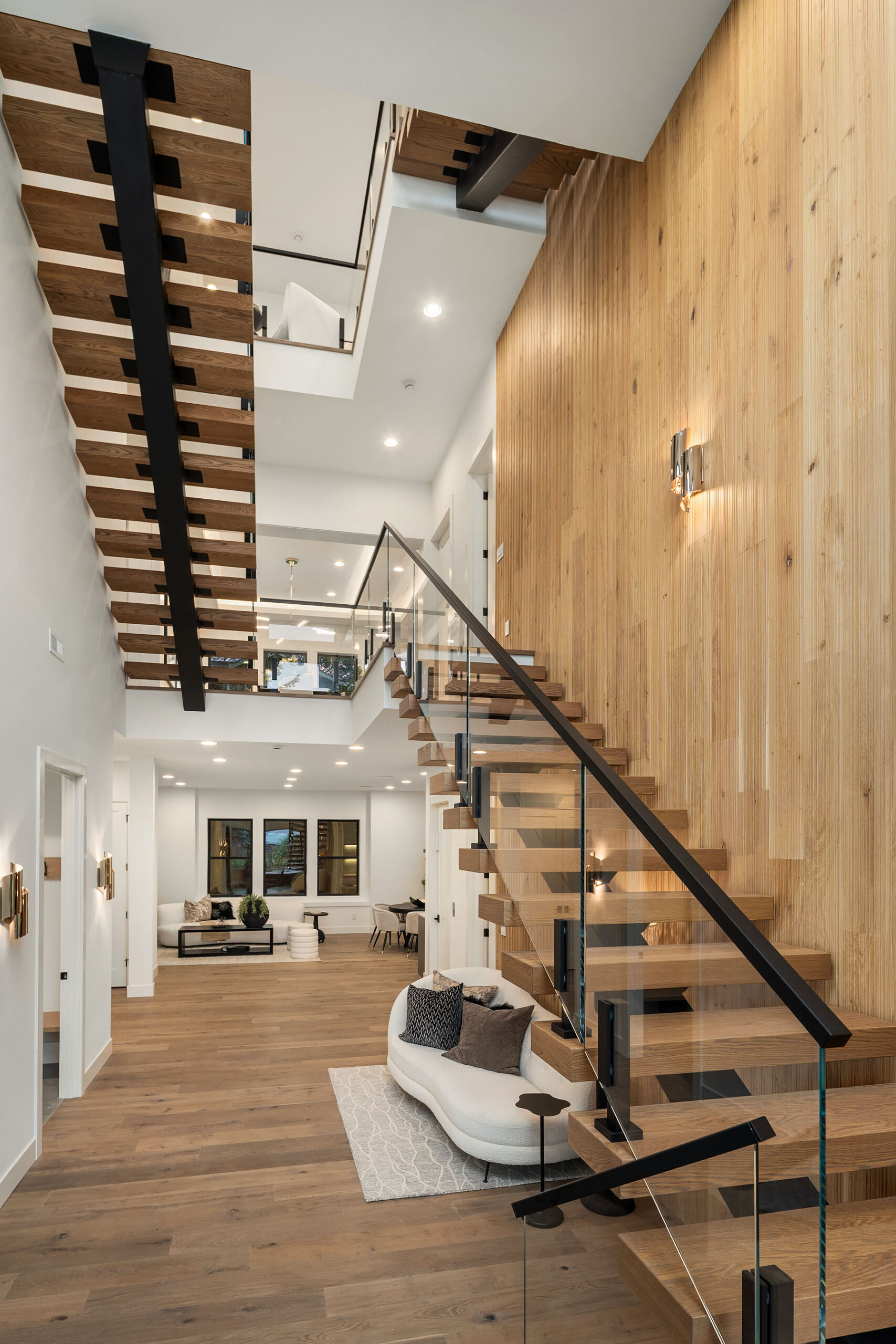 This entryway captures the essence of design with rising floating stairs and clear glass railing. FLIGHT Mono connects the multiple levels with elegance while the glass railing creates clear views between spaces.