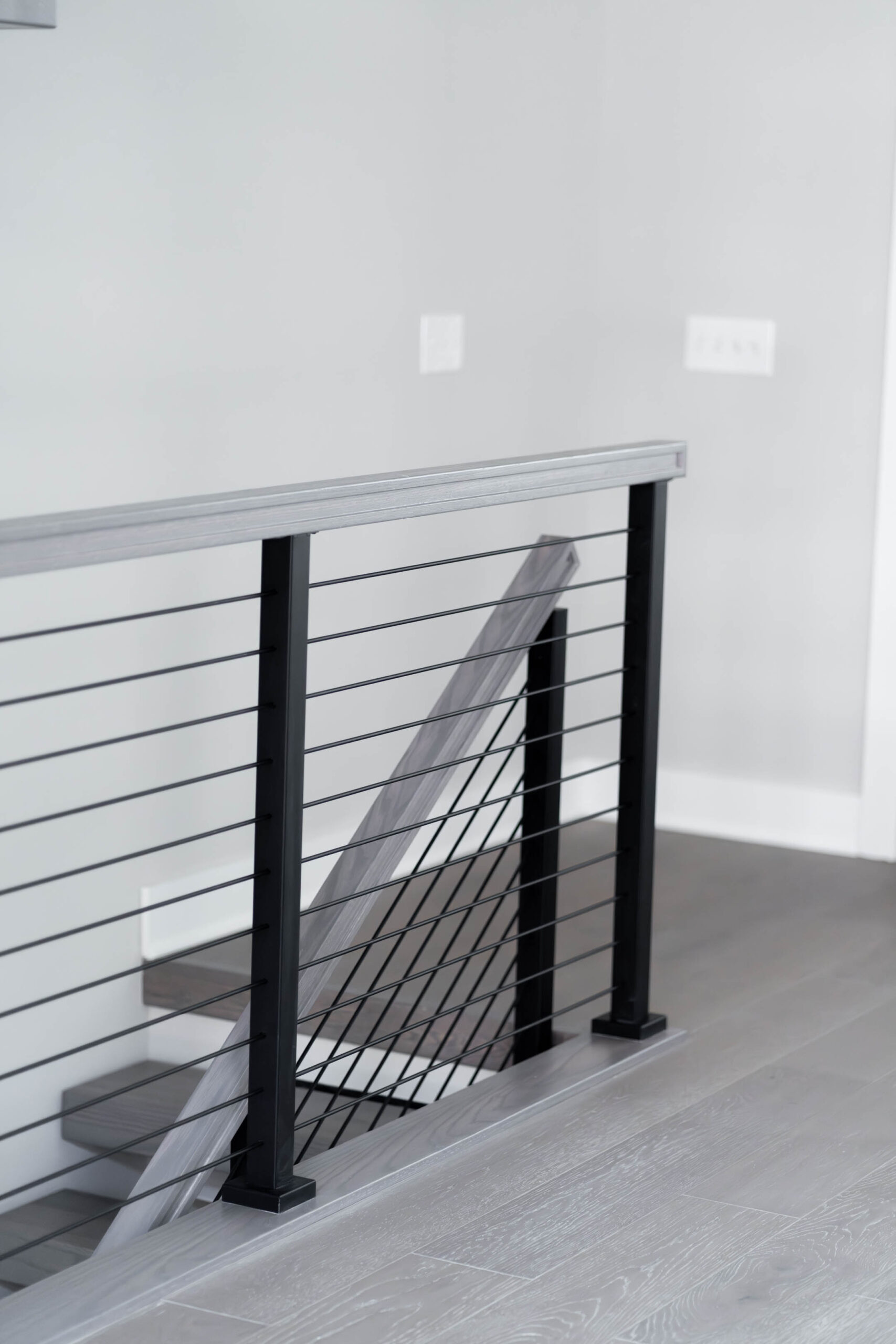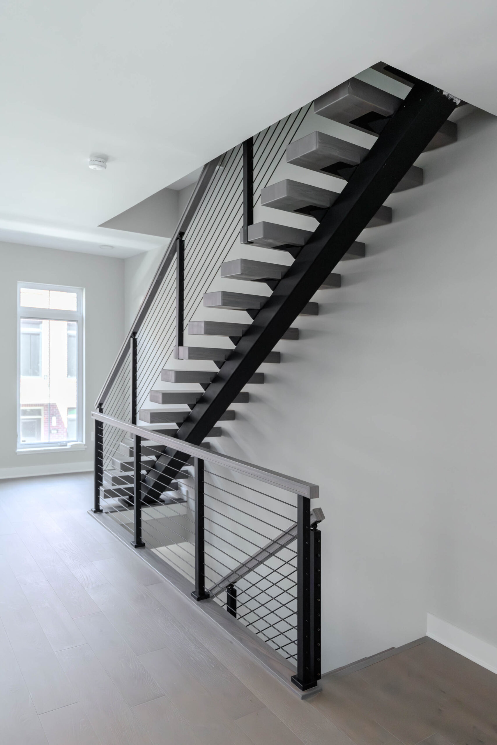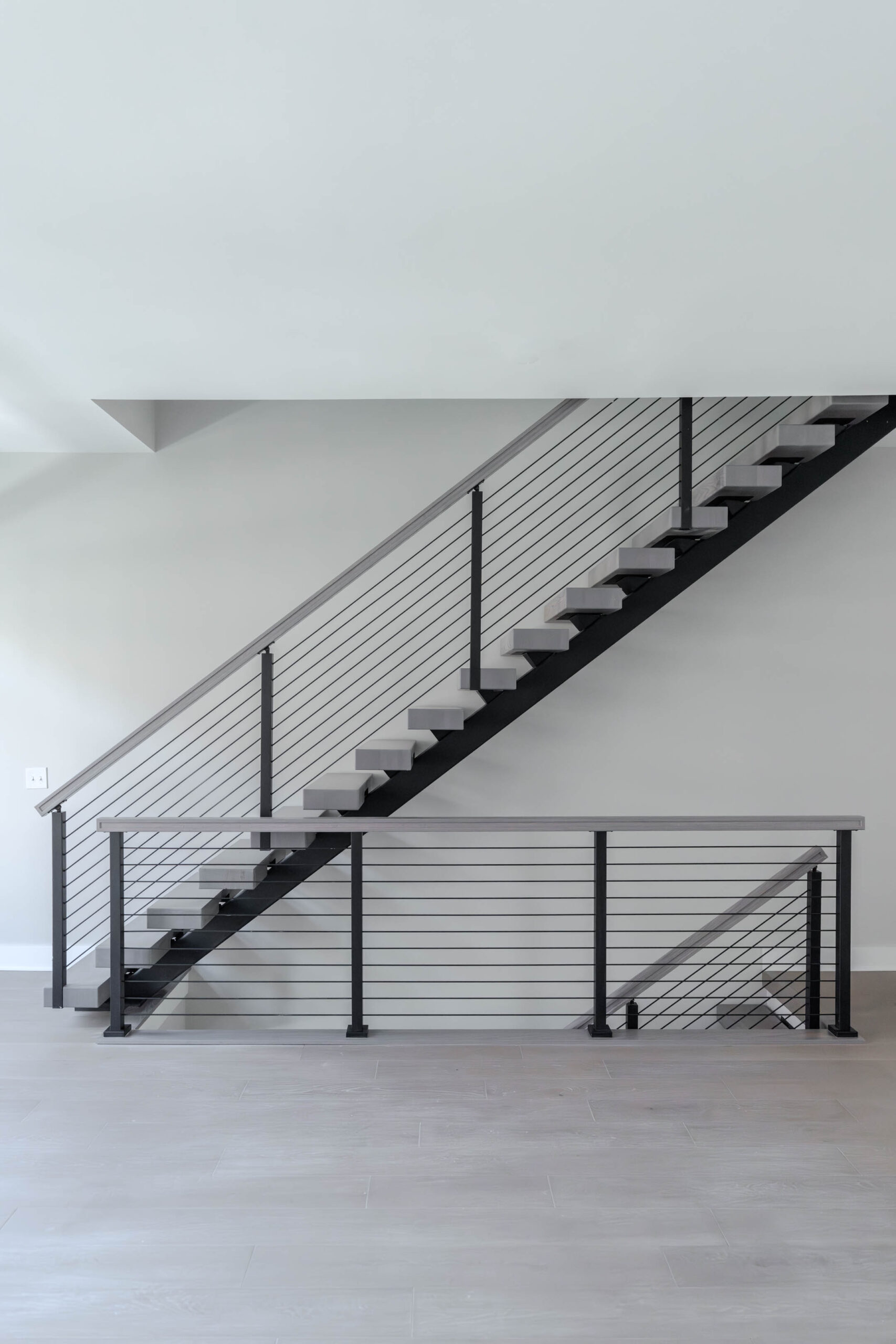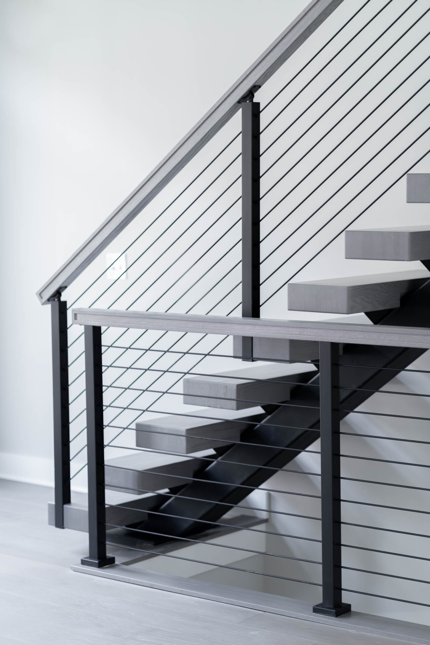 Emphasize any room with a defining color palette. This FLIGHT Mono combines solar grey treads and handrail that contrast beautifully against a light background. With the addition of matching Onyx rods, this system stands out with modern excellence.