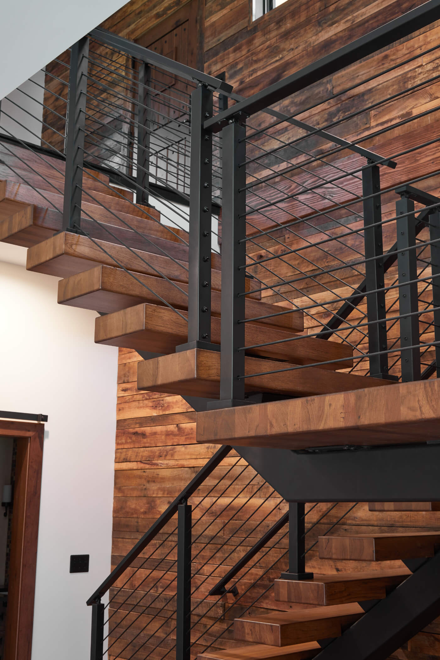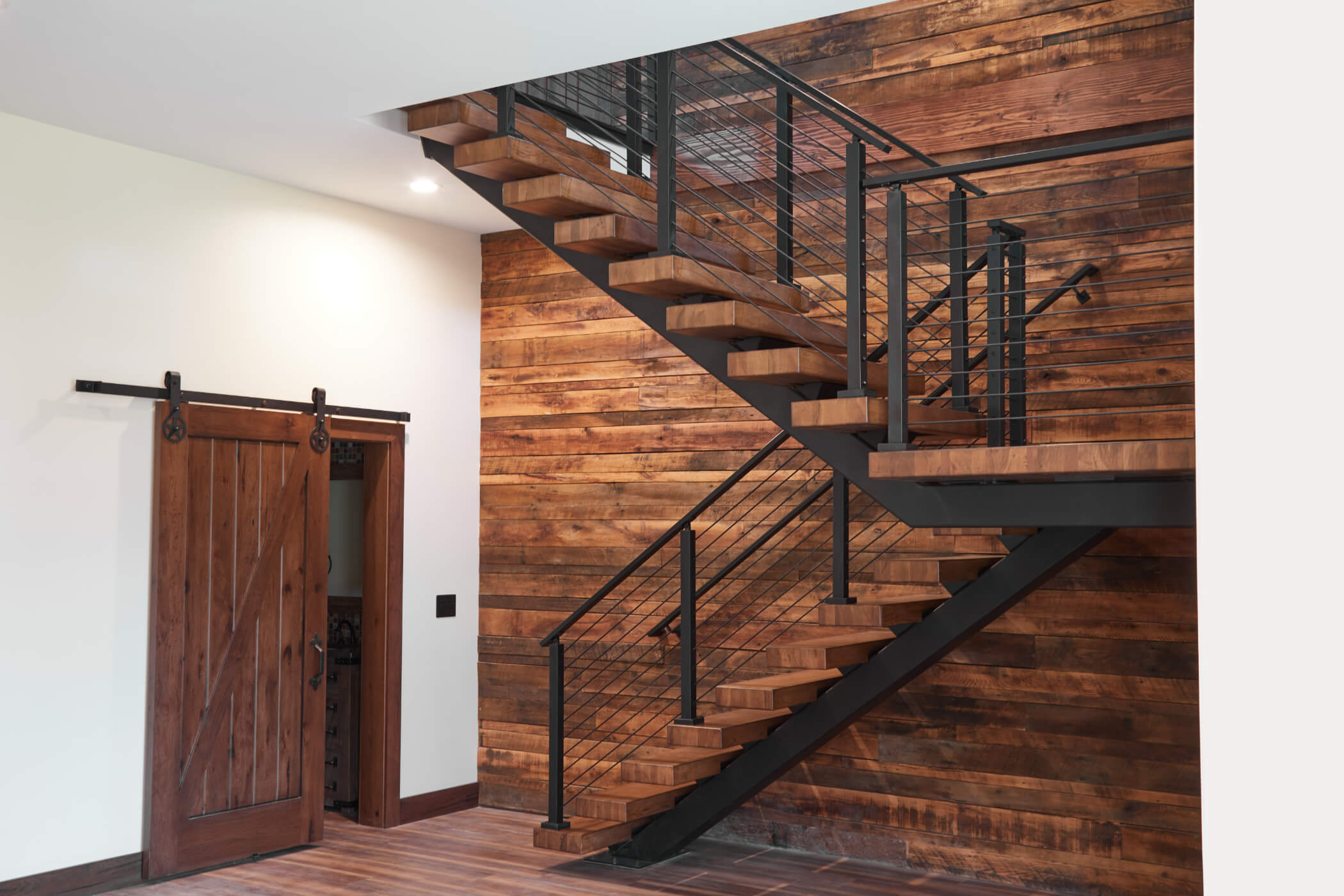Hickory stair treads match the wood wall behind this staircase perfectly.