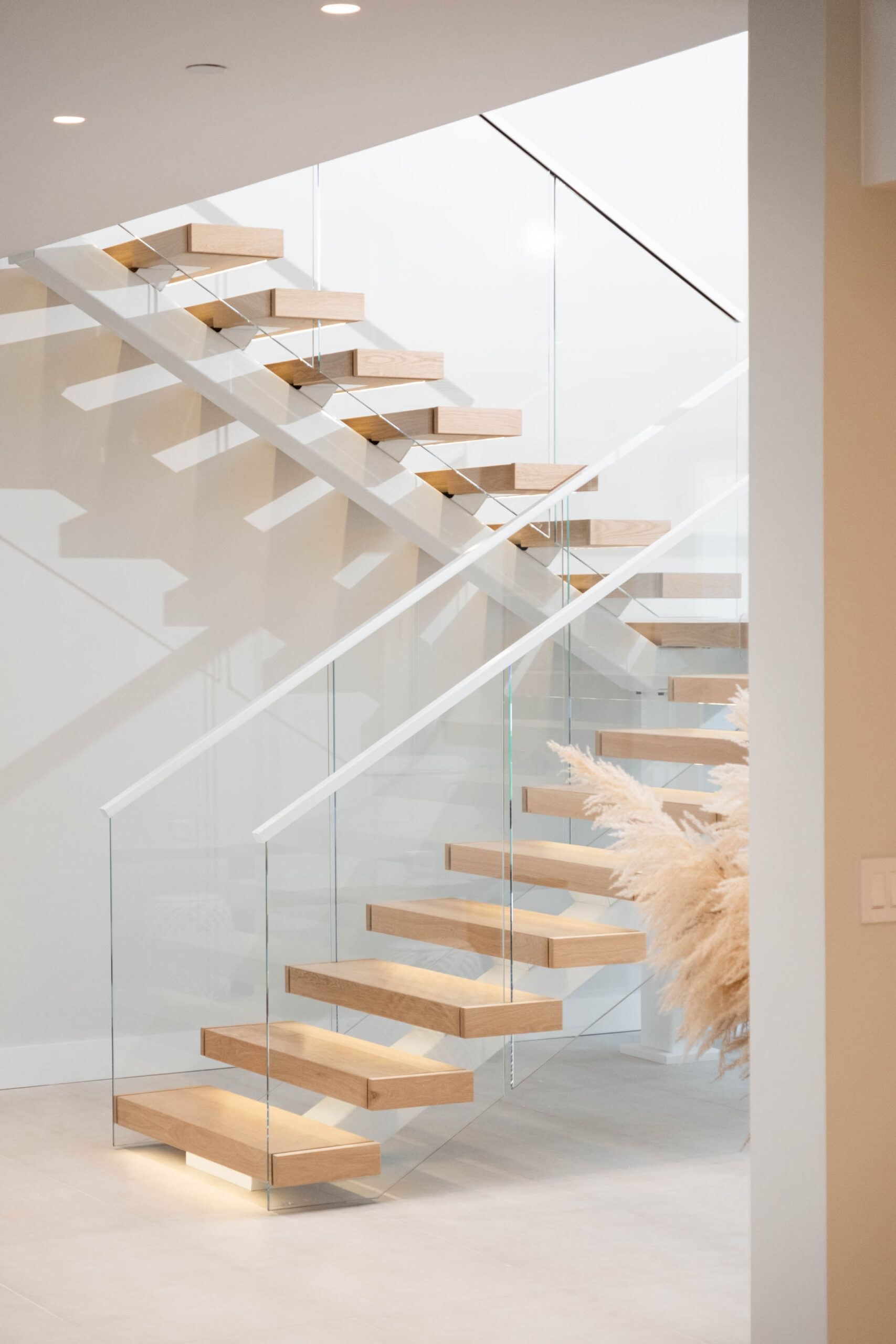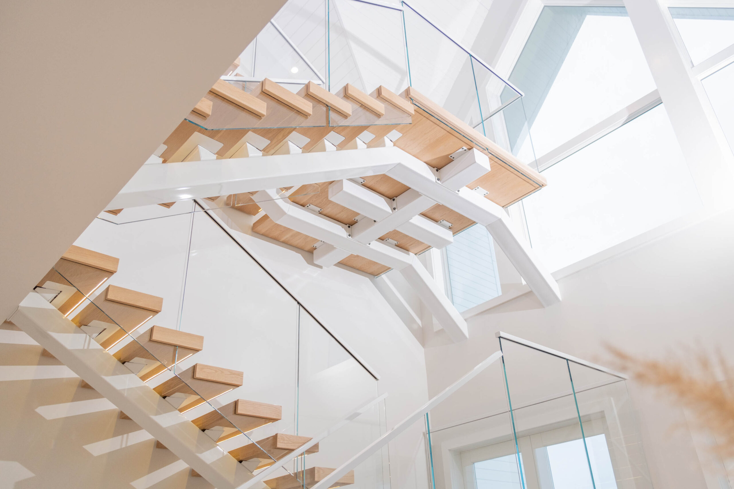 A double switchback rises from the entry to the third floor, preserving a spacious, light-filled interior. The Bright White stringer pairs with clearcoat White Oak treads and LED accents to evoke hygge, while the glass railing keeps the architecture elevated and inviting.