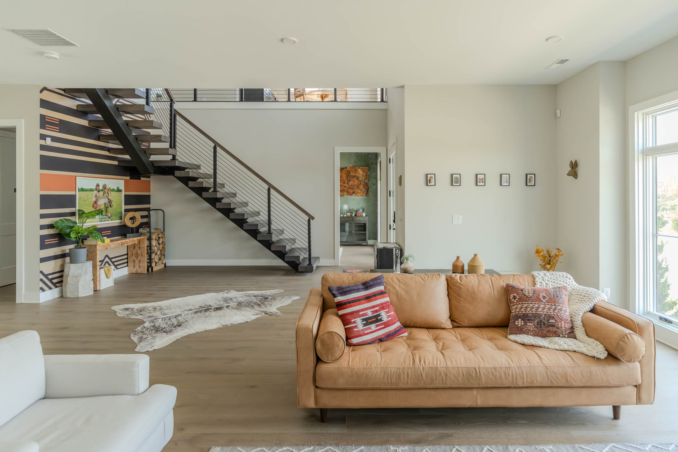 A modern space with a traditional touch. This FLIGHT Mono includes industrial-style Onyx rods, flat-top wood handrail, and modern treads. With this finishing touch to a gorgeous living room, this homeowner is ready to sit back, relax, and let the centerpiece shine.